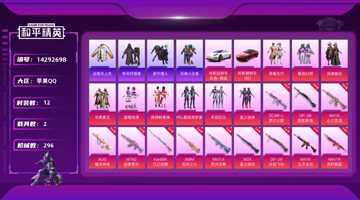 商品描述:[14292698]【特价出售】 苹果Q-113915热力值 20王牌印记 历史绝世王牌15星 254套装 296枪皮 【3载具】 阿斯顿马丁S红色 特斯拉3白色 空客蔚蓝之翼僚机 【5稀有】 奇异狩猎者 巡查衣 AKM-缤纷海域 都市猎人 浪漫天命 【9粉装】 天启纪元 深渊皇后 PEL轰鸣竞梦者 华贵君王 麻辣鲜香锅 极致幻想 草莓生巧 星之彼岸 蓝莓炮弹 【12特效枪】 SCAR-L-梦幻火箭 (7级) M416-五爪金龙 (1级) M416-心之恋语 (5级) M24-星之信仰 (4级) Mini14-龙虾霸霸 (1级) Kar98K-巳巳如意 (5级) M762-甜蜜誓约 (5级) DP-28-豹影疾电 (5级) DP-28-扶摇飞仙 (4级) AUG-暖羊咩咩 (5级) AWM-花间之火 (5级) Mini14-荧光虫舞 (5级) 【3飞行器】 精灵迷巫飞行器 梦幻火箭飞行器 萌物绒绒飞行器 【46热门】 暗夜之虎 浪漫假日 仓鼠灰灰 雪山精英 东方飞龙 梦魇先生 万圣娃娃 鹰眼刺客 好奇恐龙 软萌银虎 奇迹天团 激萌罗小黑 暗夜之虎 深海小丑鱼 大橘为重 浪漫波比 童话森林 神秘黑猫 暗夜契约 暗影哥特 醒狮腾龙 团圆交子 瑞龙福将 纯白誓言 粉红小猪 水银刺客 梦之呓语 爱神 青龙圣者 粉甜马卡龙 海洋之心 机械英豪 破蛋小黄鸡 风华少年志 白月香洋装 软嫩糖心蛋 黑色刀锋 赛博空间 不夜海上花 M416-魔法学院 M416-仓鼠灰灰 M762-瑞龙福将 M249-古堡领主 AUG-魔法学院 Kar98K-深海曼妙 M24-香水柠檬 【8头盔】 九霄头盔 精灵迷巫头盔 梦幻火箭头盔 甜心宝贝头盔 金风玉露头盔 甜蜜誓约头盔 马卡龙头盔 花间之火头盔 【9背包】 九霄背包 精灵迷巫背包 梦幻火箭背包 甜心宝贝背包 静灵氛围背包 深海小丑鱼背包 深海曼妙背包 神秘黑猫背包 花间之火背包