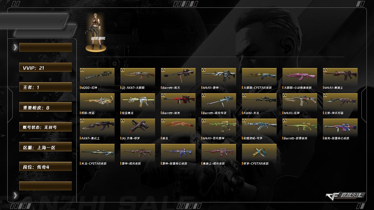 M8279/东部/上海一区/可排位/18V/幻神/4修罗/火麒麟/雷神/黑骑士/死神/黑武士/无影神兵利器/机械迷城穹宇/天龙/毁灭/极光/【角色】/零纪元/战地猎狐/【音效卡/碧霄极光音效卡/】/【枪皮】/火麒麟心动糖果/炫金武器/炫金黑龙/【小人枪/火麒麟零纪元/*2/KAC锯式机枪黑桃战神/】/永久AC/找回包赔