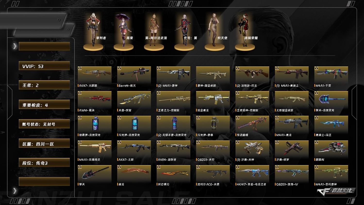 M8283/西部/四川一区/可排位/50v/无幻神/传说幽瞳/FAMAS天戒/QBZ独角/加利尔天袭/QBZ天罚/裁决/玫瑰精灵/王者猎神/觉醒版/王者之力/觉醒版/炽芒碟刃/【角色】/审判者/雨棠/不败狙神/零纪元/幻面灵狐/葵阿尔法武装/蛇隐宗/【音效卡】/朱雀电竞之星音效卡/炼狱百战金芒音效卡/幻神竞星跃动音效卡/屠龙电竞之星音效卡/【枪皮】/雷神耀金/无影耀金/黑骑士暗月/毁灭英雄计划/【炫金】/炫金黑龙/【小人枪】/朱雀蛇隐宗/水枪不败狙神/FAL救世主/白狐AK47魔将/*6/次元之矛M200/*6/斯泰尔幻面灵狐/永久AC/找回包赔