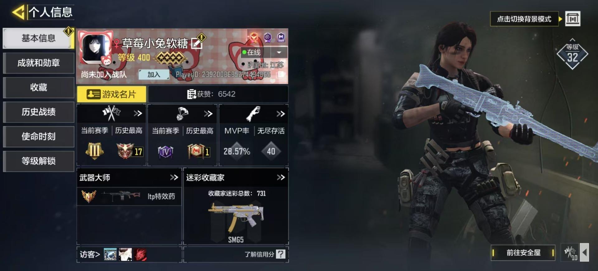[14142115]400级 7神话 2典藏 22传说 736史诗 段位无 可二次 可修改实名 【典藏枪械】:HG40-灵魂羁绊·典藏,SKS-粒子震击·典藏【神话枪械】:SMG5-潮海汐月,MG42-永别,Grau 5.56-源核天灾,FFAR 1-无境空刃,M13-黑耀星辰,Kilo141-暗夜奏鸣曲,Switchblade X9-瞬影斩决【传说枪械】:HDR-狂笑终章,PKM-共生体,S36-甜心诱惑,M4-皇家黑魂,AN94-毁灭浪潮,Type25-赤焰复仇,电锯-狂暴小丑,SA80-狂暴冲锋,AK47-火箭炮,FFAR 1-星彩乐手,CR56-回音律动,电棍-永恒炽热,G37-群山灿阳,DRH-蝮蛇潜渊,Outlaw-艳阳时刻,JAK12-聚能封锁,50GS-路阻且长,HBR3-蜜蜂工厂,Maddox-晶流梦魇,PKM-麋鹿,Thumper-惊魂火炮