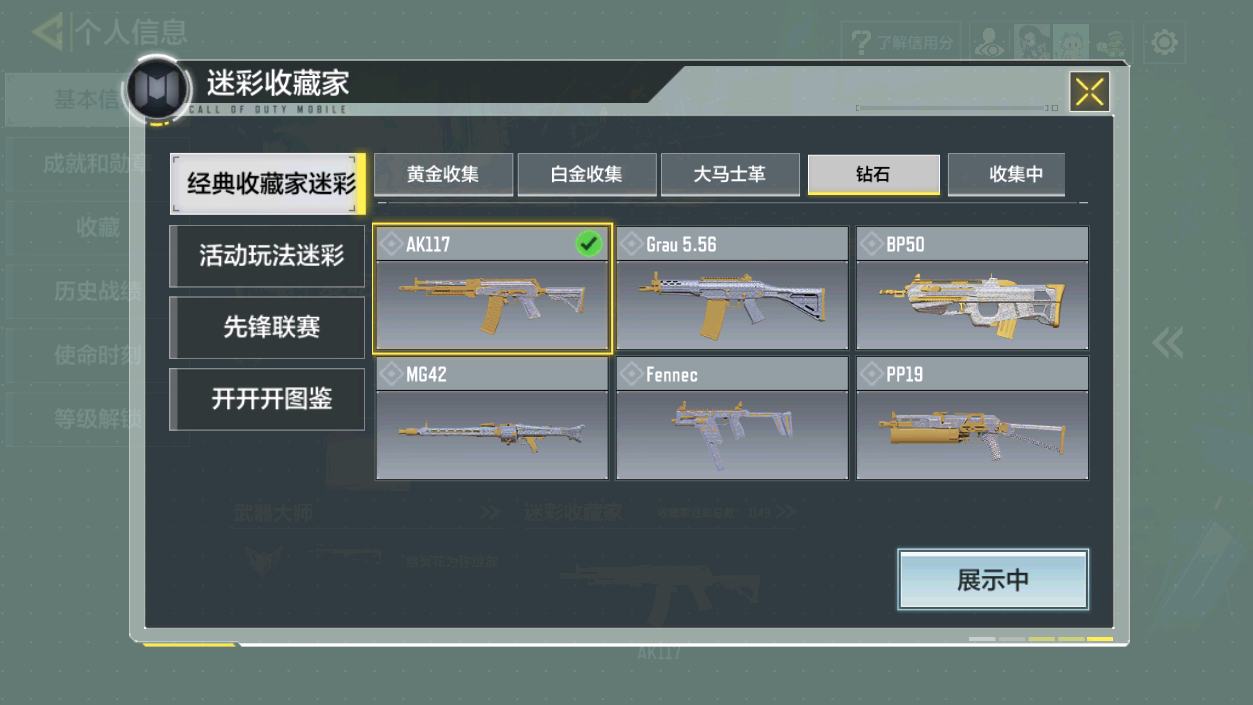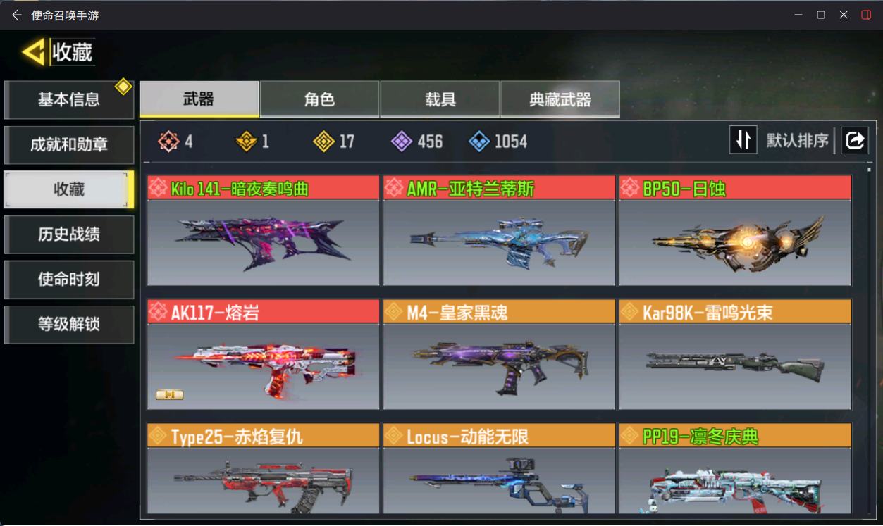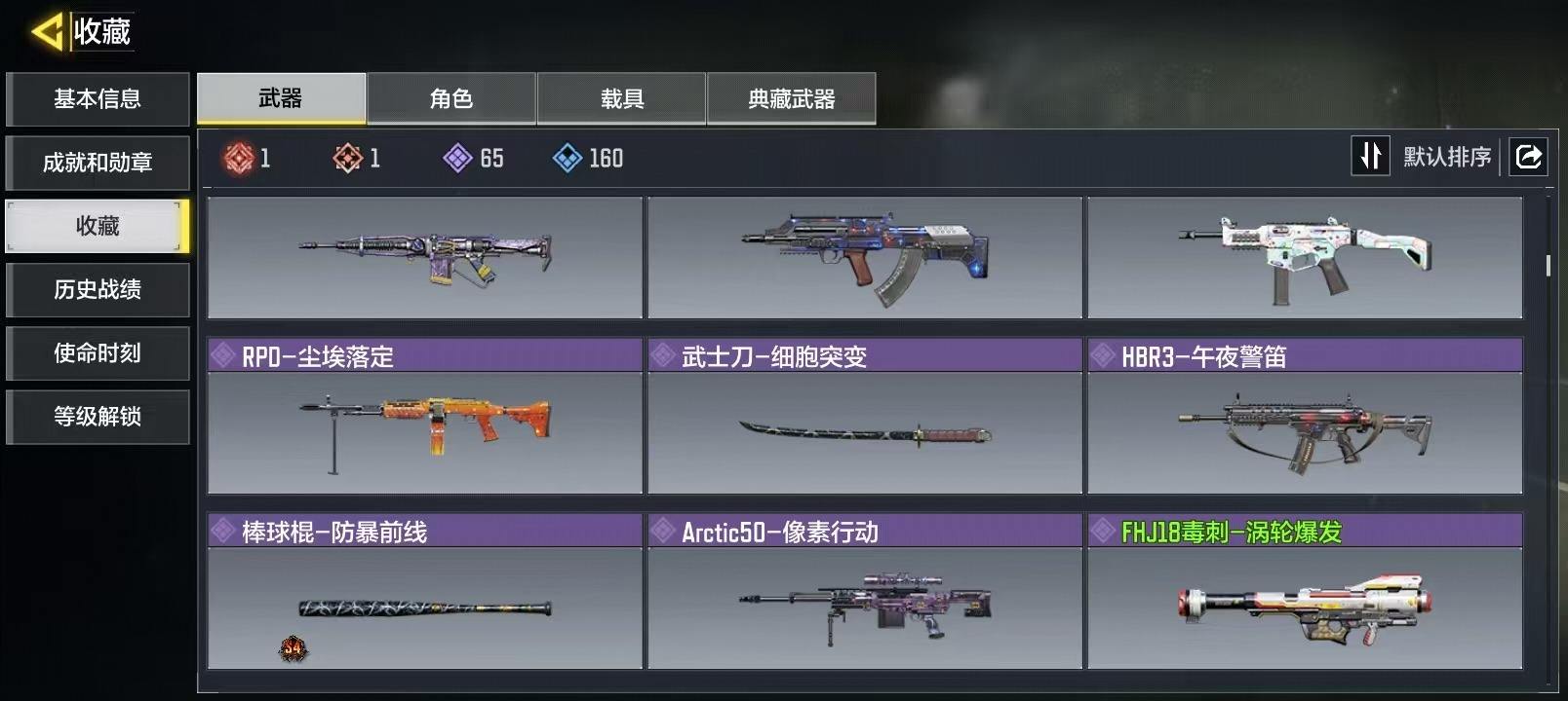【1神话】 AK117-熔岩 【1传说】 SA80-狂暴冲锋 XPR50-白狼牙 HDR-狂笑终章 电棍-永恒炽热 CR56-回音律动 AK47-火箭炮 飞翼浮游炮-高达 M4-皇家黑魂 FFAR 1-星彩乐手 AKS 74U-神灯灵愿 RPD-一路悠扬 DLQ33-狂热祈愿 Striker-源代码 【381史诗660普通武器146角色49载具】 无二次 安卓Q-段位战神 400级