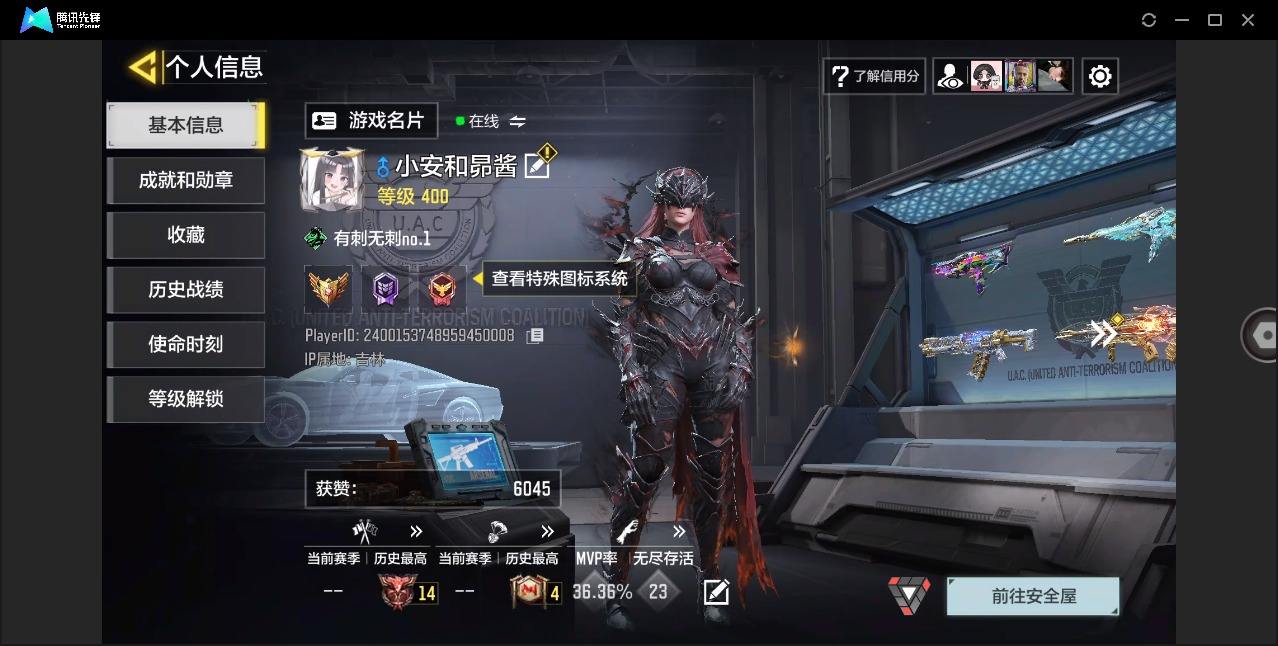 [17977587]400级 4神话 11传说 247史诗 段位钻石 可二次 可修改实名 【神话枪械】AK117-熔岩,Holger26-黑暗曙光,AK47-三重幻境,AGR-飞翔的荷兰人【传说枪械】M4-皇家黑魂,RPD-一路悠扬,DLQ33-狂热祈愿,FFAR 1-星彩乐手,Striker-源代码,电棍-永恒炽热,CR56-回音律动,AK47-火箭炮