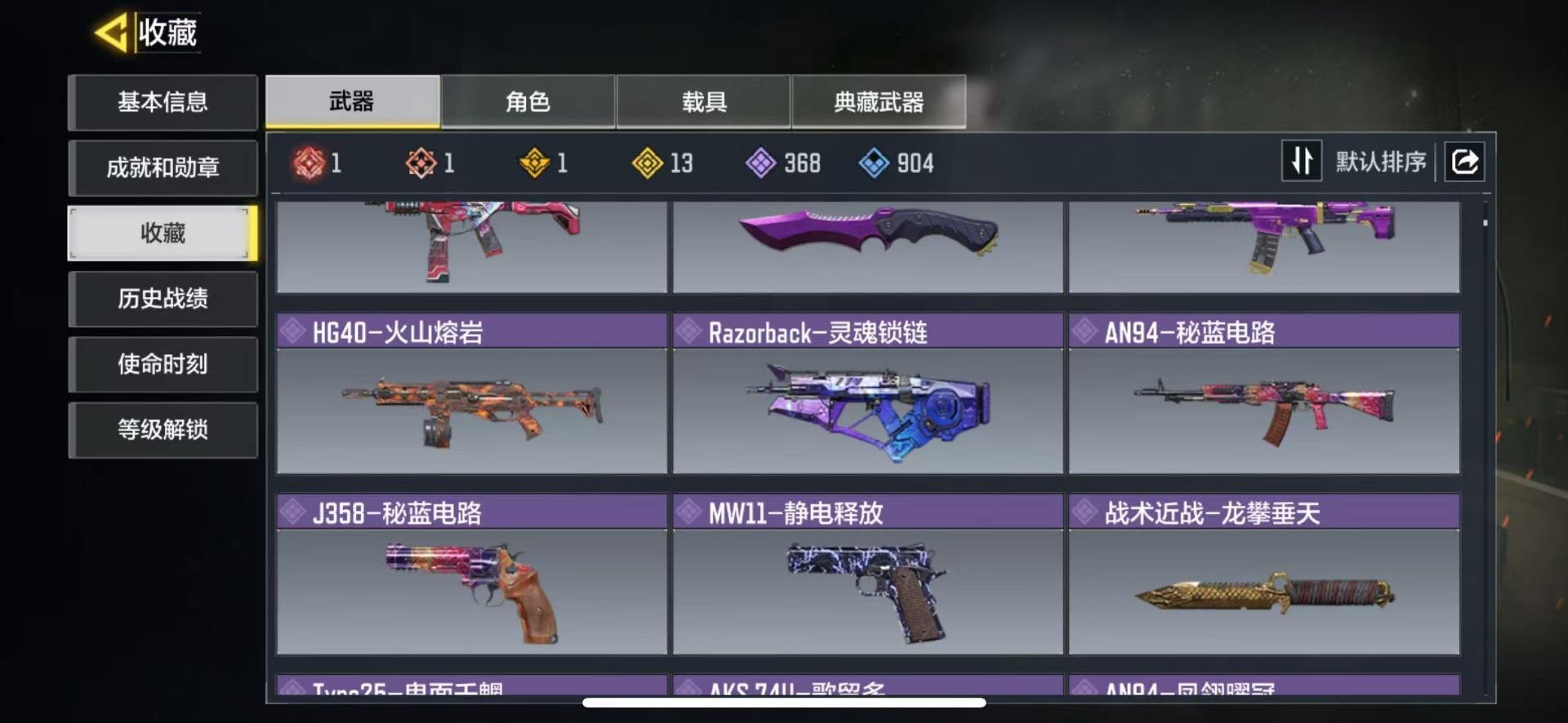 [16342285]400级 1神话 13传说 368史诗 段位黄金 可修改 【神话枪械】Fennec-无畏【传说枪械】M4-皇家黑魂,Type25-赤焰复仇,FFAR 1-星彩乐手,光束镰刀-地狱死神高达,M13-暗影荣光,Locus-红色彗星,Fennec-阿克西斯奇迹,Krig 6-苍天之剑,AK47-火箭炮,Chopper-地狱猎犬,AN94-异界银狼,Shorty-最后机会