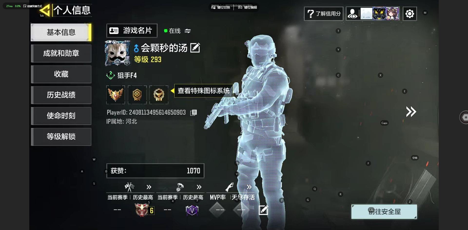 [15578340]271级 4神话 1典藏 10传说 236史诗 段位战神 可二次 可修改实名 【神话枪械】AK117-熔岩,USS9-焕光跃迁,Type19-丹青万壑,EM2-苍穹【传说枪械】FFAR 1-星彩乐手,Locus-红色彗星,Krig 6-苍天之剑,RPD-一路悠扬,AK47-火箭炮,CR56-回音律动,Renetti-钢铁幻影