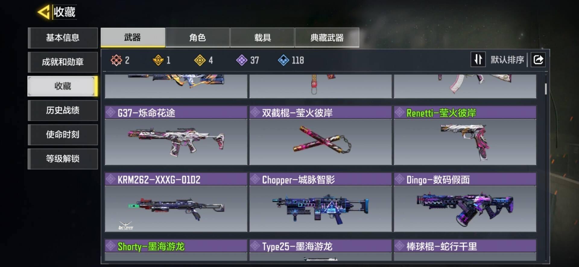MHZ2652【4神话25传说 动能无限 狼狙 1典藏】安卓Q-等级400-史诗枪械391【4神话】 MG42一永别 Fennec-无畏 AK117-熔岩【25传说】Locus-动能无限 DL033-先进火力 LW3-Tundra-雪林歌谣 HDR-狂笑终章 SA80-狂暴冲锋 G37-群山灿阳 冲锋手枪-相位破碎 电棍-永恒炽热 Man0War-狱海焰火 PP19-蔑誓者 CR56-回音律动 AK47-火箭炮 PKM-共生体 Krig6-苍天之剑 飞翼浮游炮-v高达 AKS74U-神灯灵愿 M13-暗影荣光 FFAR1-星彩乐手 RPD-一路悠扬 DL033-狂热祈愿 PKM一麋鹿 M4-皇家黑魂 Striker-源代码 KN44-破局终战 【典藏传说】·典藏 MG42-永别 Krig 6-苍天之剑 DLQ33-先进火力 PKM-麋鹿