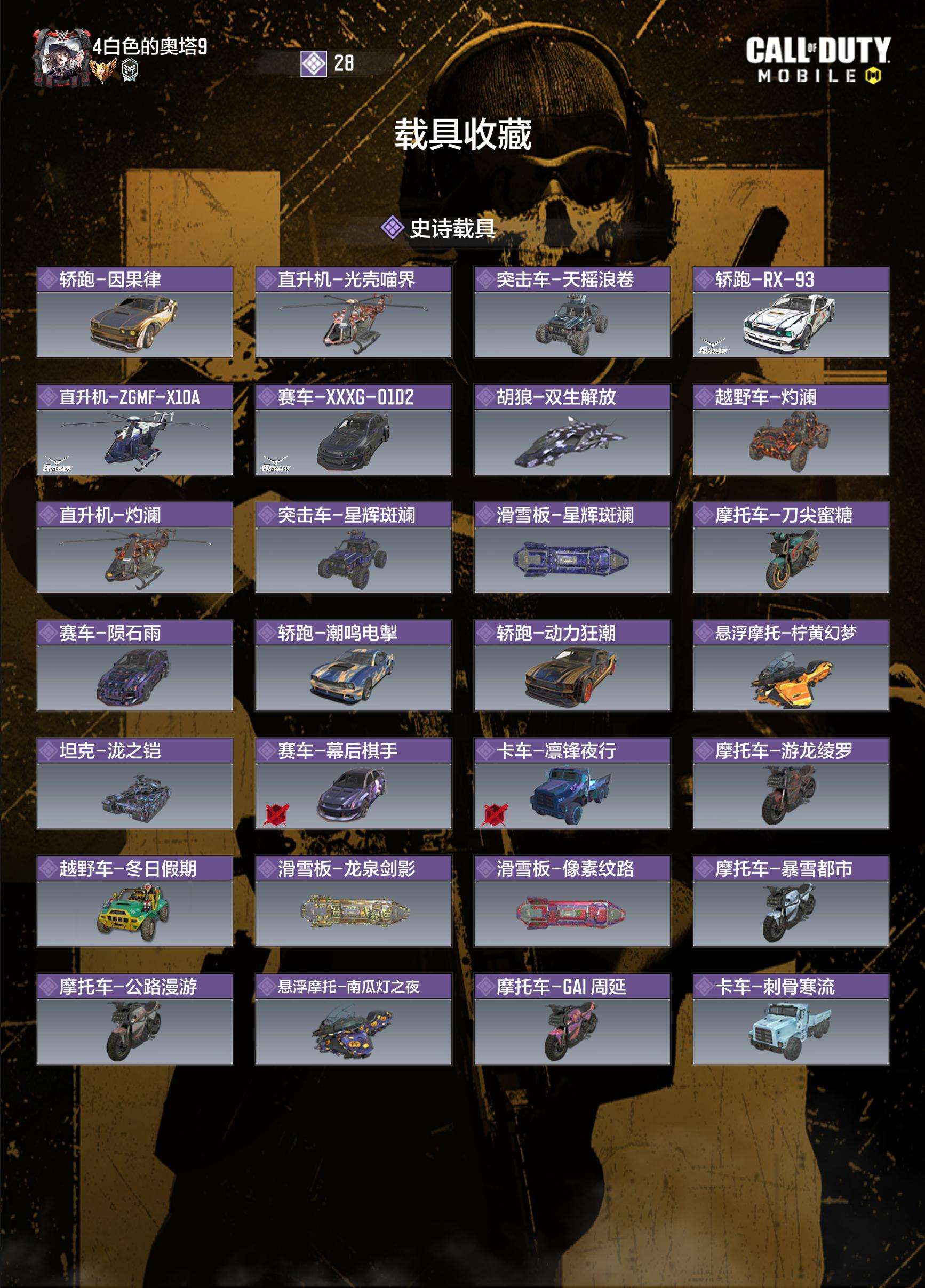 【2神话】 AS VAL-双刃剑圣 2级 AK117-熔岩 【20传说1角色】 沉影-春丽 Krig 6-苍天之剑 AN9-毁灭浪潮 S36-甜心诱惑 M4-皇家黑魂 M1887-闪耀明星 Type25-赤焰复仇 DRH-蝮蛇潜渊 SA80-狂暴冲锋 HDR-狂笑终章 电棍-永恒炽热 CR56-回音律动 AK47-火箭炮 Locus-红色彗星 飞翼浮游炮-高达 AKS 74U-神灯灵愿 FFAR 1-星彩乐手 RPD-一路悠扬 DLQ33-狂热祈愿 Striker-源代码 【607史诗1387普通武器204角色74载具】 无二次 安卓Q-段位战神 400级