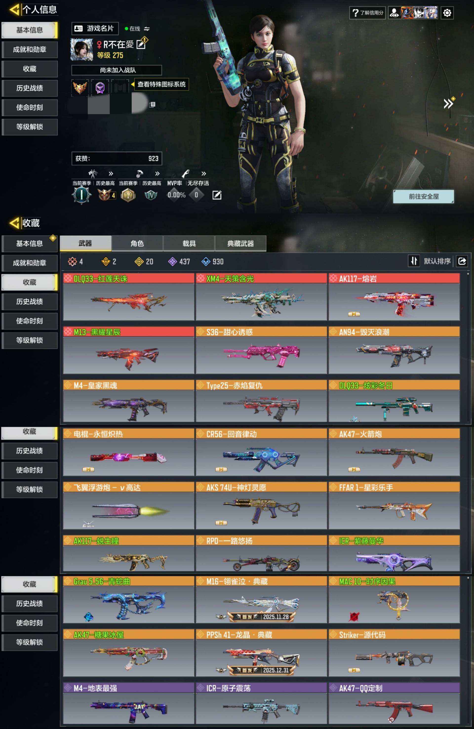 [15260398]400级 7神话 10传说 316史诗 段位大师 可修改 【神话枪械】AK117-熔岩,CX-9-希尔芙的庇佑,AS VAL-双刃剑圣,Kilo141-暗夜奏鸣曲,EM2-苍穹,SO-14-万刃灼锋【传说枪械】M4-皇家黑魂,Type25-赤焰复仇,FFAR 1-星彩乐手,RPD-一路悠扬,DLQ33-狂热祈愿,AK47-火箭炮,电棍-永恒炽热,CR56-回音律动,DLQ33-先进火力,Locus-动能无限