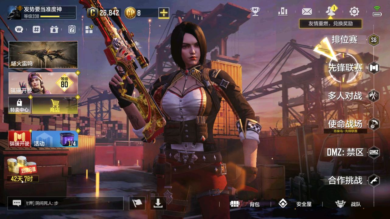 MHZ2642【 1神话 10传说 圣诞狙】安卓Q-等级360-史诗枪械344【神话】 AK117-熔岩【传说】Type25-赤焰复仇 DLQ33-炫彩冬日 AK47-火箭炮 电棍-永恒炽热 DLQ33-狂热祈愿 RPD-一路悠扬 SA80-狂暴冲锋 Striker-源代码 M4-皇家黑魂 飞翼浮游炮-V高达