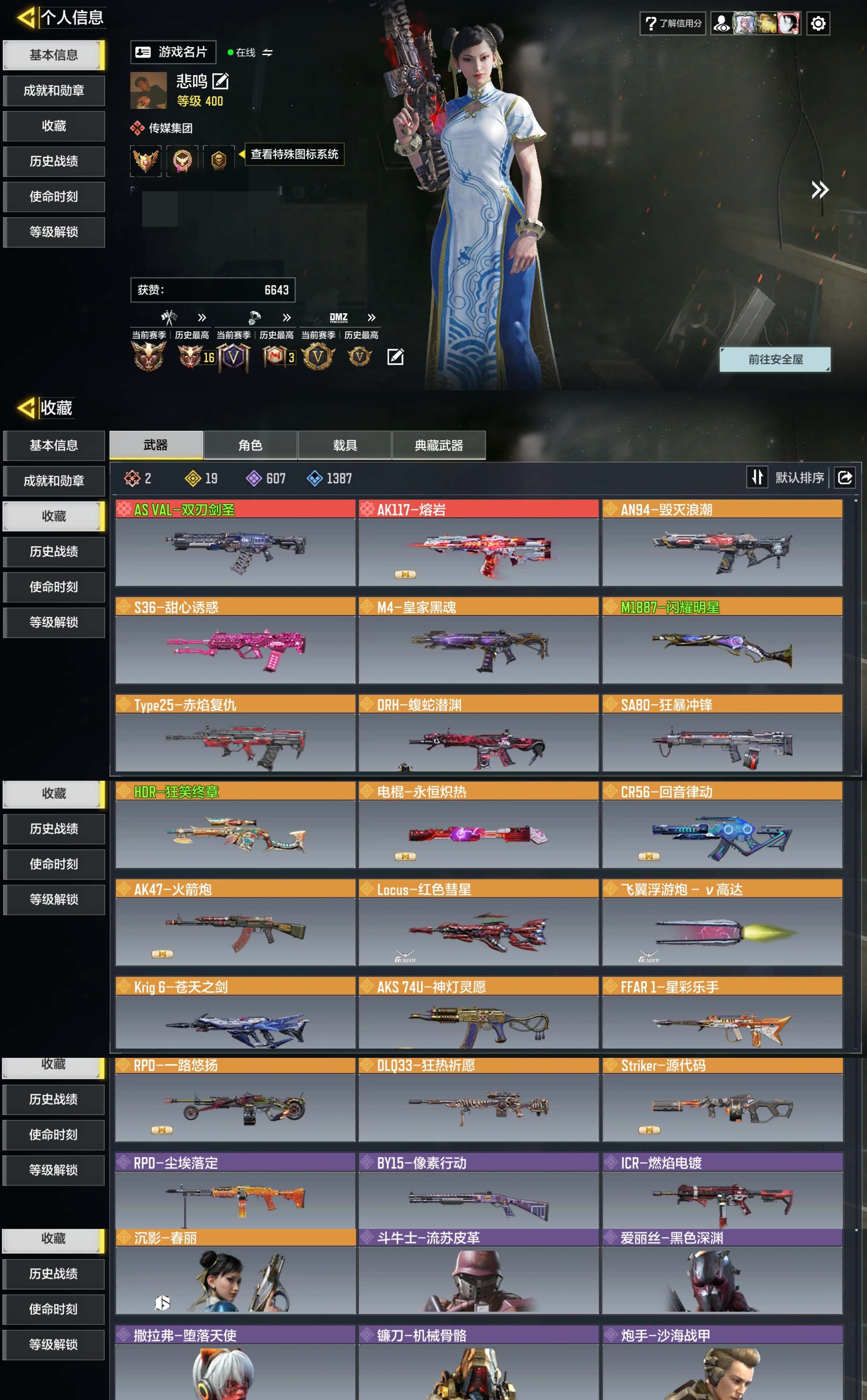 [15995318]400级 6神话 1典藏 23传说 600史诗 段位黄金 可二次 可修改实名 【典藏枪械】SKS-粒子震击·典藏【神话枪械】SMG5-潮海汐月,AK117-熔岩,USS9-焕光跃迁,MG42-永别,CX-9-希尔芙的庇佑,FFAR 1-无境空刃【传说枪械】M13-紫炎舞,HDR-狂笑终章,AKBP-塞壬律曲,M4-皇家黑魂,KN44-寒鸦,Type25-赤焰复仇,SA80-狂暴冲锋,Striker-源代码,RPD-一路悠扬,AK47-火箭炮,电棍-永恒炽热,CR56-回音律动,G37-群山灿阳,PP19-星乐章,DLQ33-先进火力,Kar98k-雷鸣光束,M13-花晨月夕,M1887-闪耀明星,DRH-蝮蛇潜渊,Locus-动能无限,Locus-海神之戟