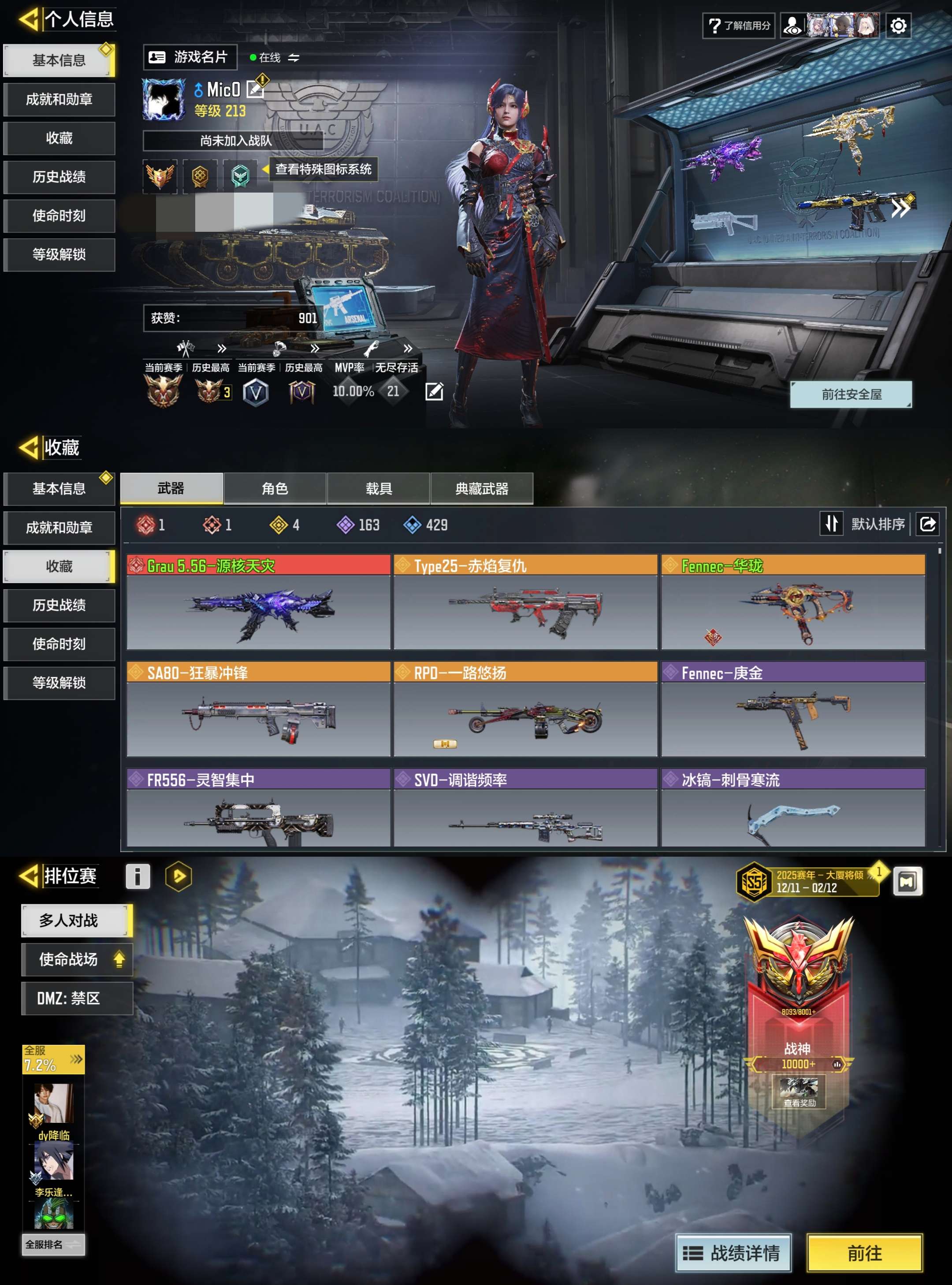 [14317472]400级 5神话 1典藏 12传说 358史诗 段位大师 可二次 可修改实名 【典藏枪械】:AK117-火龙咆哮·典藏【神话枪械】:RAM-7-星月夜,BP50-日蚀,Krig 6-冰霜巨龙,Grau 5.56-源核天灾,FFAR 1-无境空刃【传说枪械】:AKBP-塞壬律曲,龙泉剑-七星龙渊,SA80-狂暴冲锋,AK47-月华星辉,AK47-火箭炮,FFAR 1-星彩乐手,G37-群山灿阳,PP19-凛冬庆典,DLQ33-炫彩冬日,PKM-麋鹿