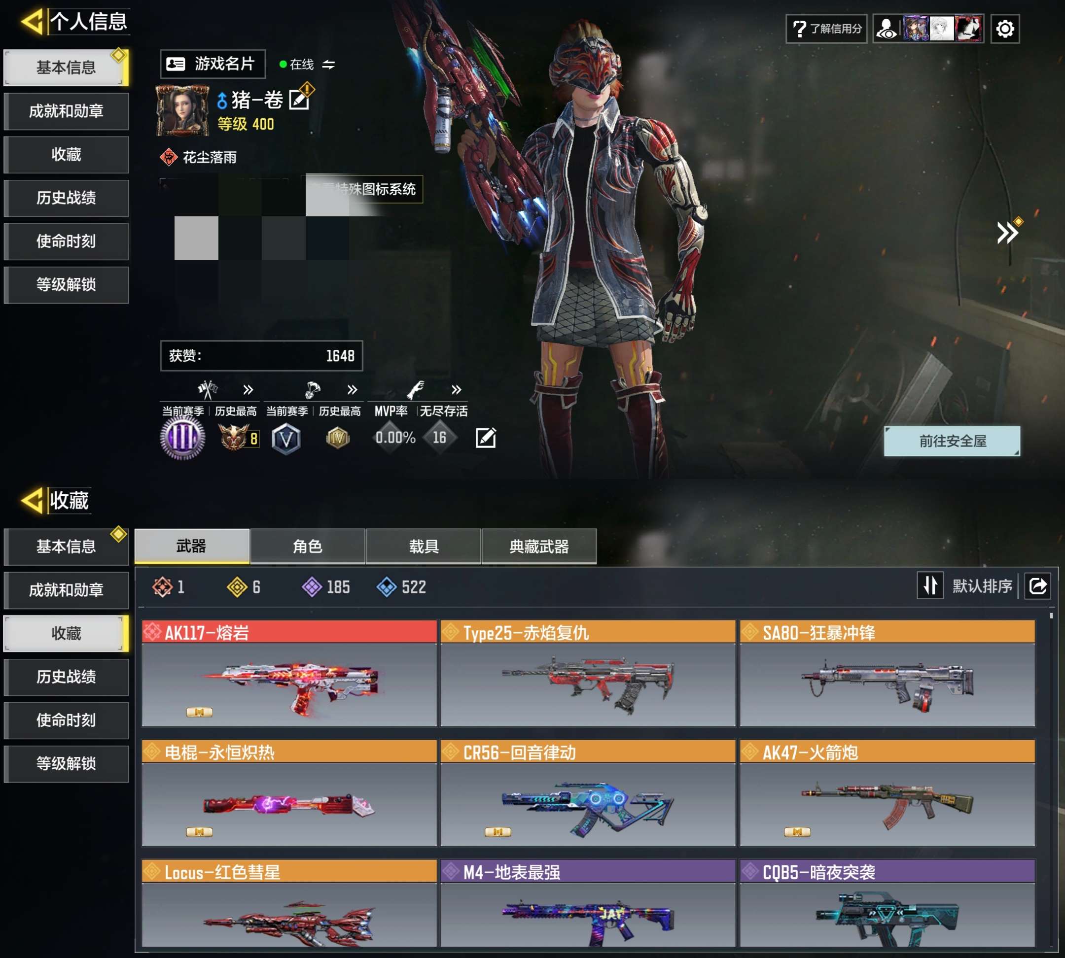 【1神话】 AK117-熔岩 【6传说】 TYpe-赤焰复仇 SA80-狂暴冲锋 电棍-永恒炽热 CR56-回音律动 AK47-火箭炮 Locus-红色彗星 【185史诗522普通武器47角色29载具】有二次 安卓Q-段位钻石 400级