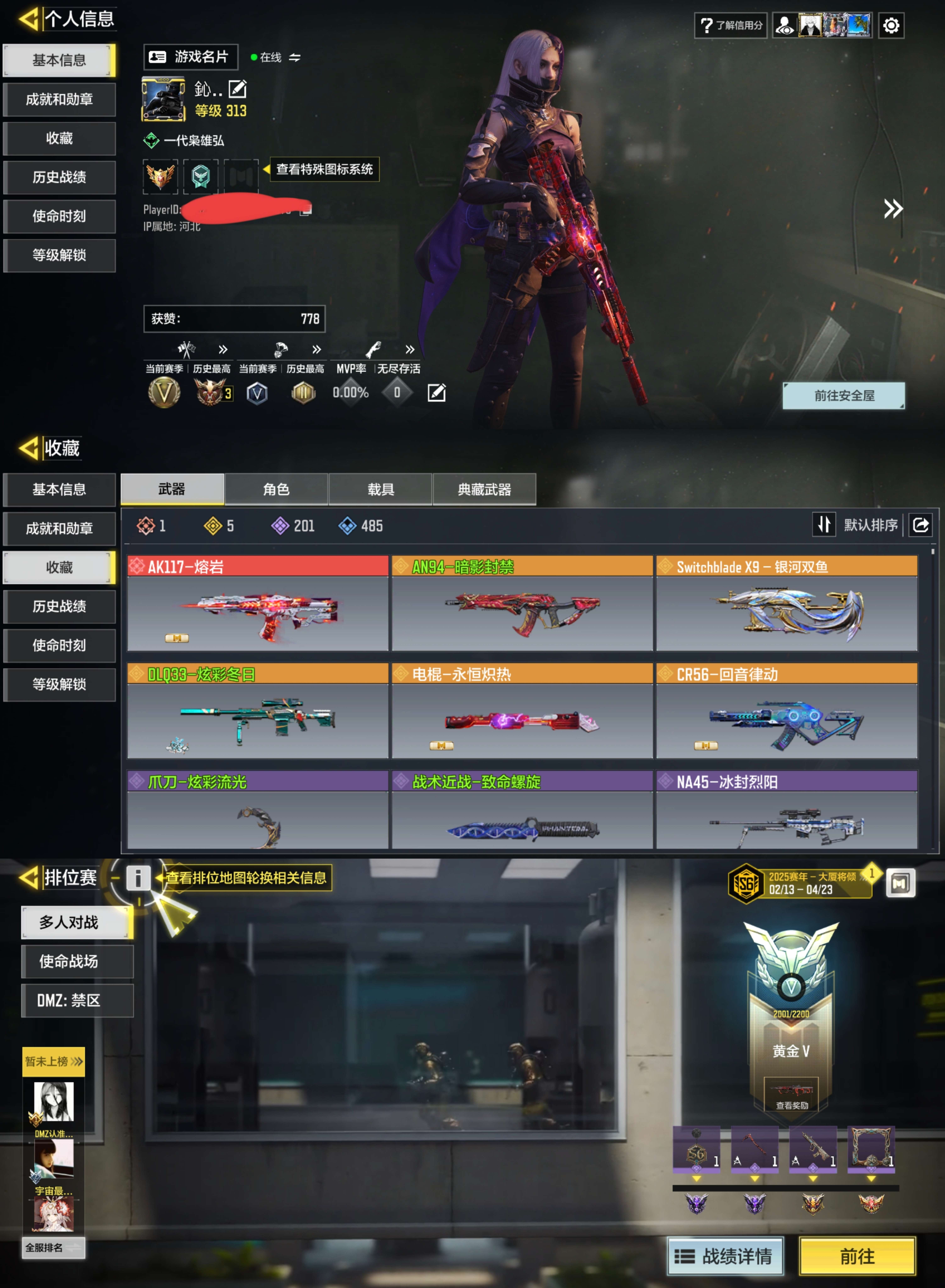 [15503794]272级 2神话 5传说 253史诗 段位黄金 可二次 可修改实名 【神话枪械】FFAR 1-无境空刃,EM2-苍穹【传说枪械】Dobvra-渊影浮光,AK47-月华星辉,电棍-永恒炽热,CR56-回音律动,ICR-苍穹沙暴