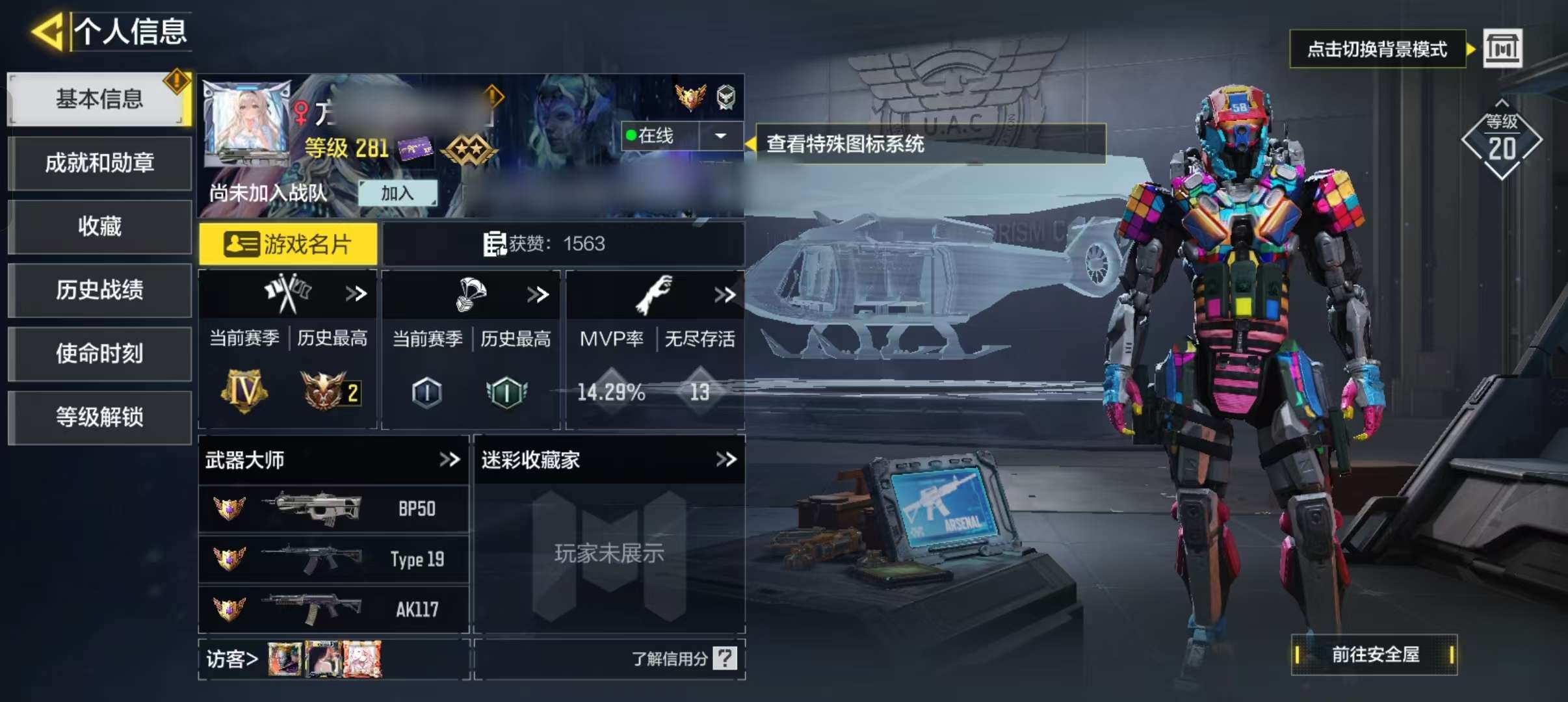 [12609728]159级 1神话 4传说 94史诗 段位白银 可二次 可修改实名 优质装备:M13-黑耀星辰,M4-皇家黑魂,Type25-赤焰复仇 传说枪械:JAK12-古海遗珍,Grau 5.56-风起浪涌