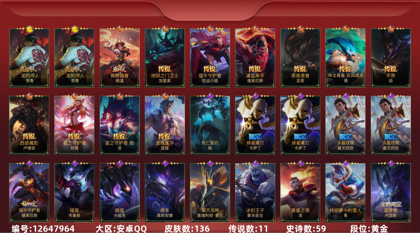 [12647964]1神话 4限定 11传说 59史诗 136皮肤 可二次 可修改实名 【段位】:黄金 【神话皮】:龙的传人 【限定皮肤】:龙的传人,广寒仙子嫦娥,掠星魔刃,水晶玫瑰皇子 【传说皮】:灵魂莲华腕豪,地狱之门卫士,西部魔影卢锡安,天煞劫,神龙尊者 驭风啸龙,黑夜使者亚索,灌篮高手,福牛守护者女枪,剪胜裁春格温,星之守护者 陨,星之守护者阿狸 【亮点】:福牛守护者女枪,灌篮高手,黑夜使者亚索,神龙尊者 驭风啸龙,天煞劫,西部魔影卢锡安,星之守护者阿狸,星之守护者 陨,剪胜裁春格温,龙的传人,灵魂莲华腕豪,龙的传人英雄联盟手游 - 安卓QQ -