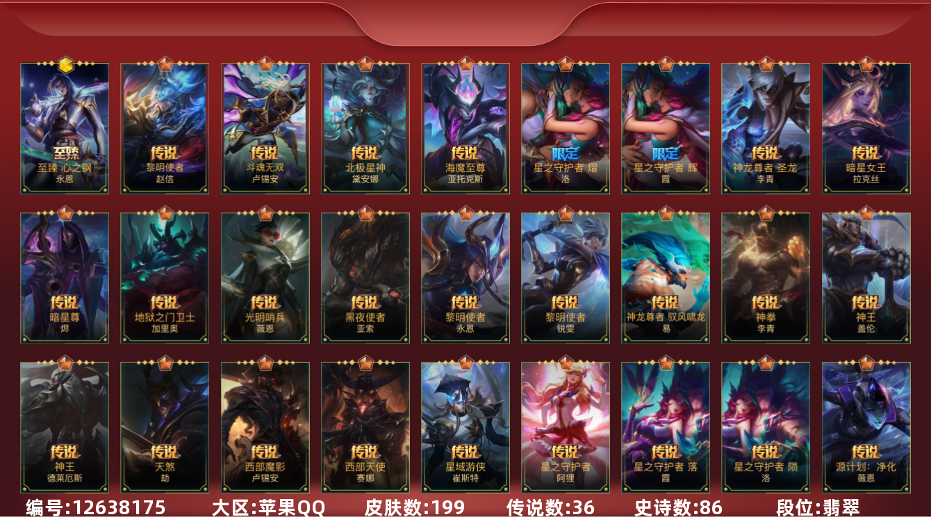 [12638175]1神话 2限定 36传说 89史诗 199皮肤 可修改 【优质装备】:暗星尊,光明哨兵薇恩,黑夜使者亚索,黎明使者锐雯,神龙尊者 驭风啸龙,神拳盲僧,神王盖伦,神王诺手,天煞劫,西部魔影卢锡安,西部天使赛娜,星域游侠卡牌,星之守护者阿狸,星之守护者 落,星之守护者 陨,源计划:净化,源计划:联合,月蚀骑士蕾欧娜,战斗学院ez,玉剑传说 武剑仙,源计划:林,源计划:泯灭,暗星女王拉克丝,最终BOSS维迦,未来战士女警,星之守护者卡莎,灵魂莲华阿狸,心之钢凯隐,至臻心之钢永恩,斗魂觉醒 莎弥拉 【段位】:翡翠 【限定皮肤】:星之守护者霞,星之守护者洛 【传说皮】:神龙尊者 圣龙 李青,黎明使者 赵信,斗魂无双 卢锡安,北极星神 黛安娜,海魔至尊 亚托克斯,斗魂无双亚索,地狱之门卫士,黎明使者永恩