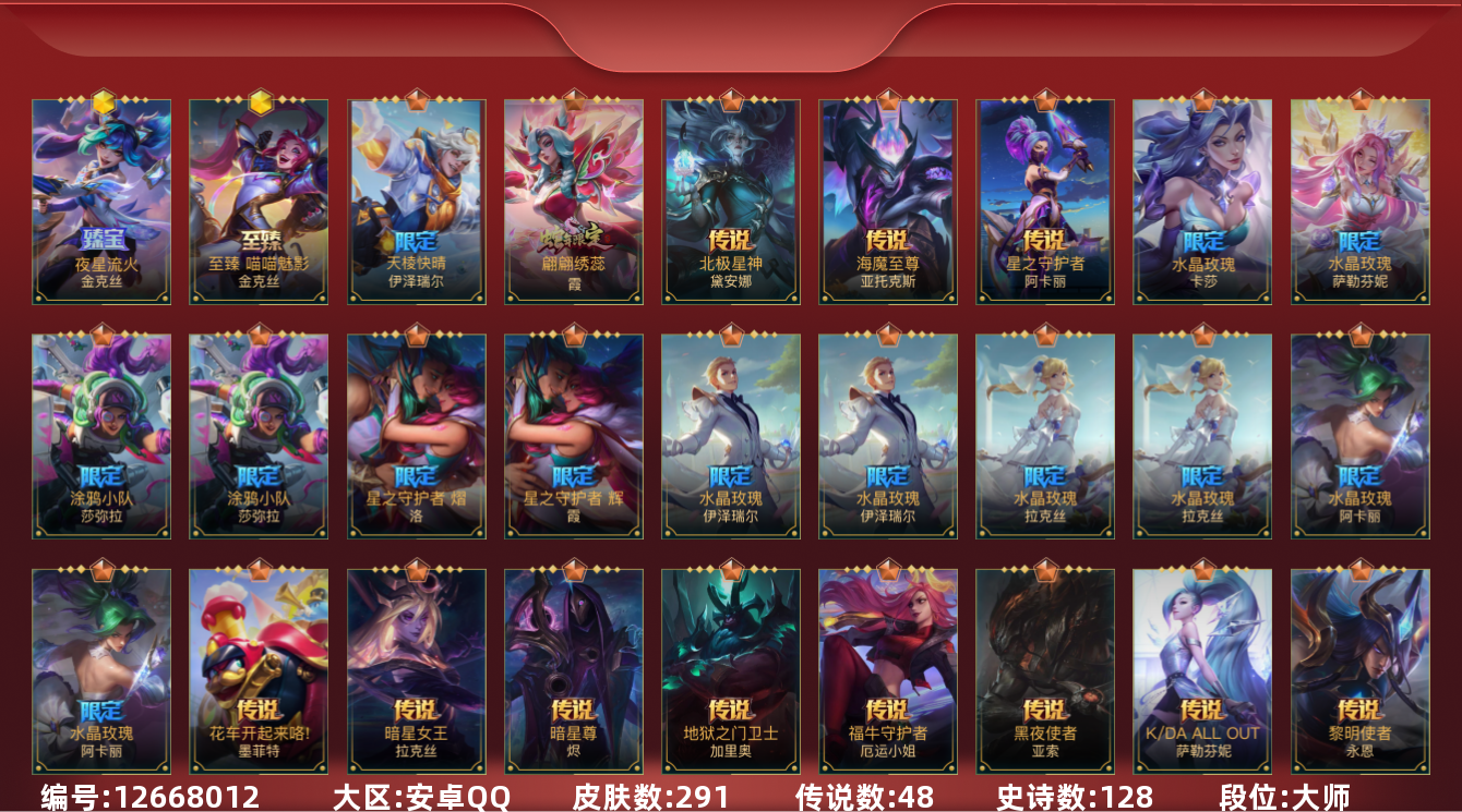[12668012]2神话 14限定 48传说 128史诗 291皮肤 可二次 可修改实名 【段位】:大师 【神话皮】:夜星流火 金克丝,至臻喵喵魅影金克丝 【限定皮肤】:钢铁军团拉克丝,赵云子龙,星之守护者霞,星之守护者洛,闭月之颜貂蝉,水晶玫瑰皇子,水晶玫瑰拉克丝,水晶玫瑰伊泽瑞尔,水晶玫瑰阿卡丽,水晶玫瑰永恩,水晶玫瑰蔚,水晶玫瑰琴女,水晶玫瑰锐雯,涂鸦小队莎弥拉 【传说皮】:暗星尊,花车开起来咯 墨菲特,黎明使者德莱文,水晶玫瑰萨勒芬妮,星之守护者卡莎,水晶玫瑰 卡莎,星之守护者 阿卡丽,水晶玫瑰 凯特琳,水晶玫瑰 阿狸,天棱快晴 伊泽瑞尔,未来战士女警,翩翩绣蕊 霞,北极星神 黛安娜,海魔至尊 亚托克斯,斗魂无双亚索,地狱之门卫士,西部魔影卢锡安,天煞劫,水晶玫瑰EZ,水晶玫瑰拉克丝,神王诺手,水晶玫瑰阿卡丽,西部天使赛娜,女主播风女,律政大亨,黎明使者锐雯,K/DA ALLOUT萨勒芬妮,黑夜使者亚索,福牛守护者女枪,西部天使寒冰,星域游侠卡牌,涂鸦小队莎弥拉,跳跳倩影女枪,最终BOSS维迦,暗星女王拉克丝,源计划:泯灭,源计划:林,黎明使者永恩,灵魂莲华锤石,星之守护者金克丝,战斗学院ez,月蚀骑士蕾欧娜,源计划:联合,源计划:净化,驯龙炮手,星之守护者 陨,星之守护者 落,星之守护者阿狸