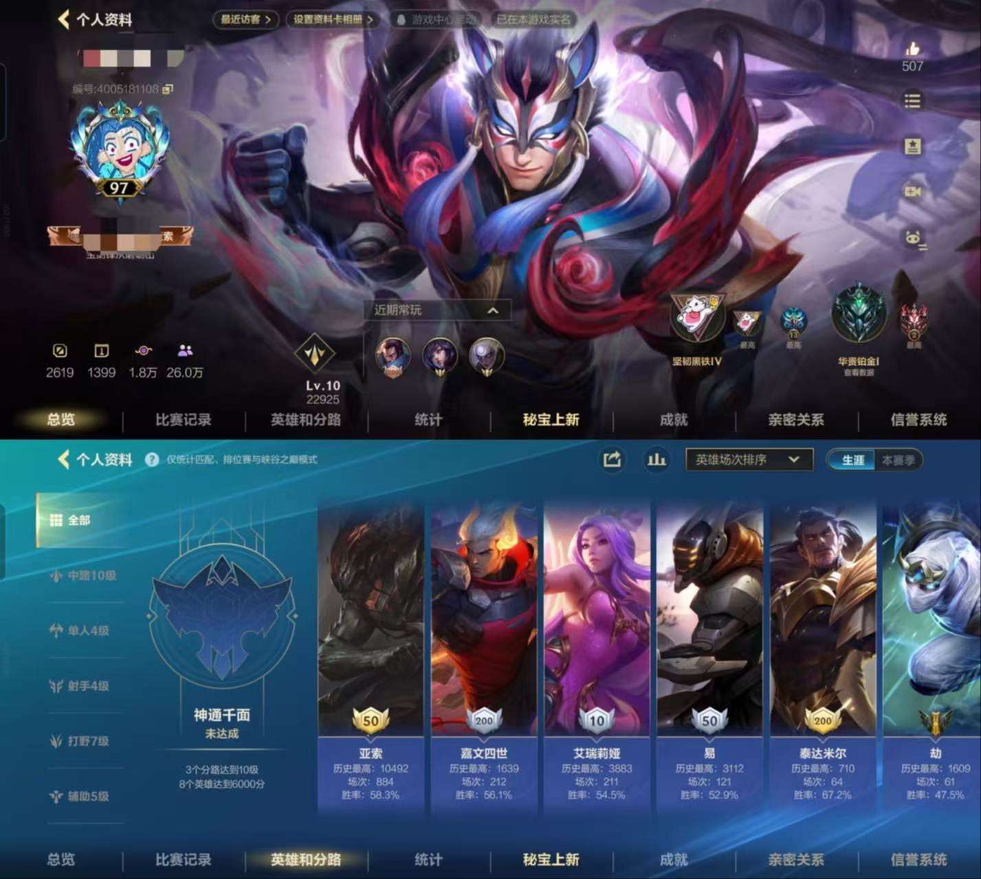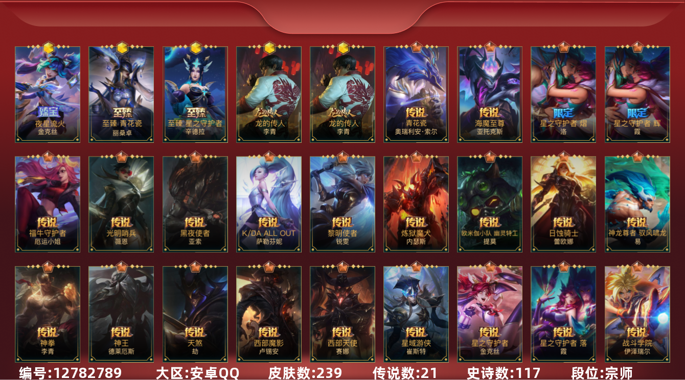 4神话 4限定 21传说 117史诗 239皮肤 可二次 可修改实名 【段位】:宗师【神话皮】:夜星流火 金克丝,至臻 星之守护者 辛德拉,至臻 青花瓷 丽桑卓,龙的传人【限定皮肤】:龙的传人,赵云子龙,星之守护者霞,星之守护者洛【传说皮】:青花瓷 奥瑞利安·索尔,海魔至尊 亚托克斯,日蚀骑士蕾欧娜,西部魔影卢锡安,天煞劫,神王诺手,神拳盲僧,神龙尊者 驭风啸龙,欧米伽小队 幽灵特工,西部天使赛娜,炼狱魔犬,黎明使者锐雯,K/DA ALLOUT萨勒芬妮,黑夜使者亚索,光明哨兵薇恩,福牛守护者女枪,星域游侠卡牌,星之守护者金克丝,战斗学院ez,星之守护者 落【亮点】:福牛守护者女枪,光明哨兵薇恩,黑夜使者亚索,K/DA ALLOUT萨勒芬妮,黎明使者锐雯,炼狱魔犬,欧米伽小队 幽灵特工,日蚀骑士蕾欧娜,神龙尊者 驭风啸龙,神拳盲僧,神王诺手,天煞劫,西部魔影卢锡安,西部天使赛娜,星域游侠卡牌,星之守护者金克丝,星之守护者 落,战斗学院ez,玉剑传说 武剑仙,龙的传人,龙的传人