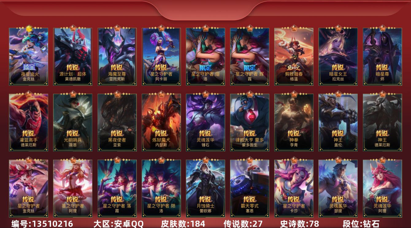 [13739964]1神话 2限定 27传说 78史诗 184皮肤 可修改 【段位】:钻石 【神话皮】:夜星流火 金克丝 【限定皮肤】:星之守护者霞,星之守护者洛 【传说皮】:暗星尊,心之钢凯隐,灵魂莲华腕豪,灵魂莲华阿狸,星之守护者卡莎,星之守护者 阿卡丽,水晶玫瑰 凯特琳,水晶玫瑰 阿狸,源计划:超体,海魔至尊 亚托克斯,霸天零式塞恩,神王诺手,神王盖伦,神拳盲僧,律政大亨,炼狱魔犬,黑夜使者亚索,光明哨兵薇恩,灌篮高手,暗星女王拉克丝,剪胜裁春格温,灵魂莲华锤石,星之守护者金克丝,月蚀骑士蕾欧娜,星之守护者 陨,星之守护者 落,星之守护者阿狸