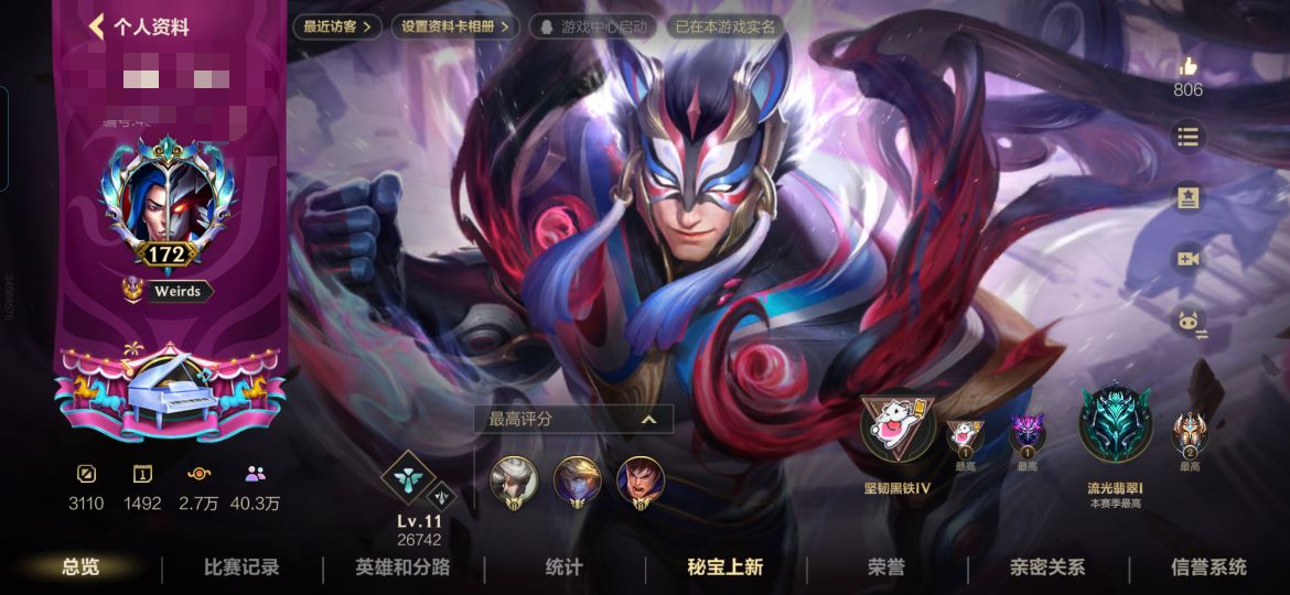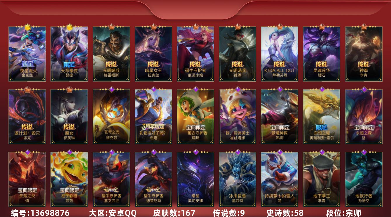 [13698876]2神话 9传说 58史诗 167皮肤 可二次 可修改实名