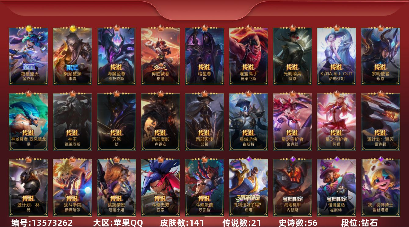 2神话 1限定 21传说 55史诗 141皮肤 可二次 可修改实名 【段位】:钻石【神话皮】:夜星流火 金克丝,乘龙破渊 李青【限定皮肤】:水晶玫瑰永恩【传说皮】:暗星尊,斗魂觉醒 莎弥拉,海魔至尊 亚托克斯,斗魂无双亚索,西部魔影卢锡安,天煞劫,神王诺手,神龙尊者 驭风啸龙,K/DA ALLOUT萨勒芬妮,光明哨兵薇恩,灌篮高手,西部天使寒冰,星域游侠卡牌,跳跳倩影女枪,源计划:泯灭,源计划:林,黎明使者永恩,剪胜裁春格温,星之守护者金克丝,战斗学院ez,星之守护者阿狸