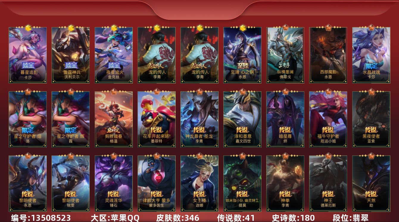 5神话 6限定 41传说 180史诗 346皮肤 可修改 【段位】:翡翠【神话皮】:夜星流火 金克丝,雷霆神兵 沃利贝尔,暮星追影 卡莎,至臻心之钢永恩,龙的传人【限定皮肤】:龙的传人,掠星魔刃,星之守护者霞,星之守护者洛,烈焰美人薇恩,水晶玫瑰琴女【传说皮】:暗星尊,水晶玫瑰 卡莎,花车开起来咯 墨菲特,神龙尊者 圣龙 李青,淳和墨意 嘉文四世,战斗学院女警,源计划:毁灭,魔女伊芙琳,心之钢凯隐,灵魂莲华腕豪,星之守护者卡莎,星域武神贾克斯,纵横墨澜 佛耶戈,西部魔影 永恩,斗魂无双亚索,西部魔影卢锡安,天煞劫,神王诺手,神拳盲僧,欧米伽小队 幽灵特工,西部天使赛娜,女主播风女,律政大亨,黎明使者锐雯,黑夜使者亚索,福牛守护者女枪,星域游侠卡牌,太空律动机器人,源计划:泯灭,源计划:林,黎明使者永恩,剪胜裁春格温,灵魂莲华锤石,星之守护者金克丝,战斗学院ez,源计划:联合,源计划:净化,驯龙炮手,星之守护者 陨,星之守护者 落,星之守护者阿狸