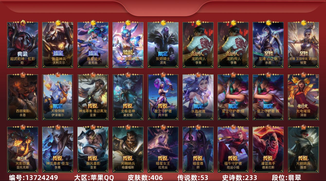 [13724249]1典藏 7神话 11限定 53传说 233史诗 406皮肤 可修改 【段位】:翡翠 【典藏皮】:超武乾坤:虹影 【神话皮】:夜星流火 金克丝,臻藏 翩翩绣蕊 霞,雷霆神兵 沃利贝尔,至臻锐雯,灰烬骑士派克,至臻心之钢永恩,龙的传人 【限定皮肤】:龙的传人,斩星魔剑,星之守护者霞,星之守护者洛,神龙烈焰金克丝,张辽文远,水晶玫瑰皇子,美猴王,水晶玫瑰永恩,水晶玫瑰蔚,关羽云长 【传说皮】:暗星尊,光电璀璨泽丽,水晶玫瑰 卡莎,神龙尊者 圣龙 李青,御风墨影 亚索,斗魂觉醒 莎弥拉,黎明使者德莱文,光影巨翼亚托克斯,源计划:毁灭,魔女伊芙琳,心之钢凯隐,灵魂莲华腕豪,星之守护者卡莎,星之守护者 阿卡丽,西部魔影 永恩,水晶玫瑰 凯特琳,水晶玫瑰 阿狸,天棱快晴 伊泽瑞尔,神龙尊者 昼日真龙 亚索,北极星神 黛安娜,霸天零式塞恩,斗魂无双亚索,西部魔影卢锡安,天煞劫,神王诺手,神王盖伦,神拳盲僧,神龙尊者 驭风啸龙,欧米伽小队 幽灵特工,女主播风女,律政大亨,炼狱魔犬,黎明使者锐雯,K/DA ALLOUT萨勒芬妮,黑夜使者亚索,光明哨兵薇恩,灌篮高手,福牛守护者女枪,西部天使寒冰,太空律动机器人,跳跳倩影女枪,光明哨兵格雷福斯,暗星女王拉克丝,源计划:泯灭,源计划:林,黎明使者永恩,星之守护者金克丝,战斗学院ez,源计划:联合,源计划:净化,星之守护者 陨,星之守护者 落,星之守护者阿狸