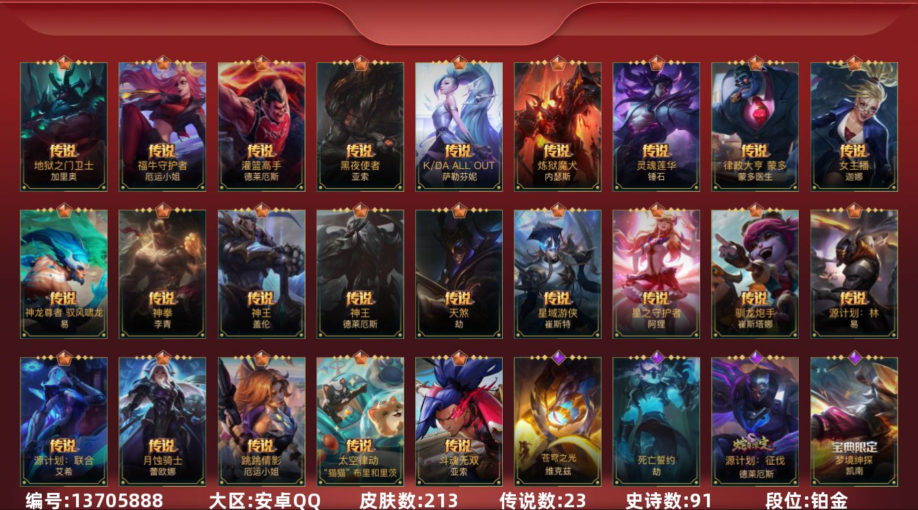 [13705888]2限定 23传说 91史诗 213皮肤 可修改 【段位】:铂金 【限定皮肤】:赵云子龙,冬季仙境发条 【传说皮】:地狱之门卫士,天煞劫,神王诺手,神王盖伦,神拳盲僧,神龙尊者 驭风啸龙,星域游侠卡牌,女主播风女,律政大亨,炼狱魔犬,K/DA ALLOUT萨勒芬妮,黑夜使者亚索,灌篮高手,福牛守护者女枪,斗魂无双亚索,太空律动机器人,跳跳倩影女枪,源计划:林,星之守护者阿狸,灵魂莲华锤石,月蚀骑士蕾欧娜,源计划:联合,驯龙炮手