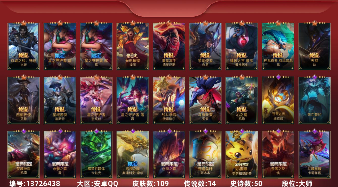 2限定 14传说 50史诗 109皮肤 可修改 【段位】:大师【限定皮肤】:星之守护者霞,星之守护者洛【传说皮】:光电璀璨泽丽,心之钢凯隐,双城之战:殊途 杰斯,西部天使寒冰,天煞劫,神龙尊者 驭风啸龙,星域游侠卡牌,律政大亨,灌篮高手,星之守护者金克丝,斗魂无双亚索,黎明使者永恩,战斗学院ez,星之守护者 落【亮点】:【优质装备】:灌篮高手,律政大亨,神龙尊者 驭风啸龙,天煞劫,西部天使寒冰,星域游侠卡牌,星之守护者金克丝,星之守护者 落,战斗学院ez,心之钢凯隐