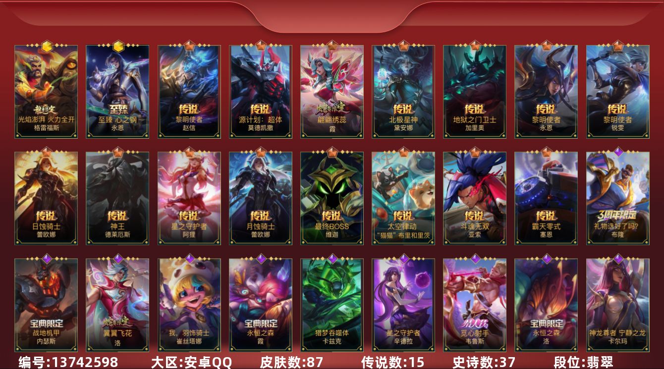 [13742598]2神话 15传说 37史诗 87皮肤 可修改 【段位】:翡翠 【神话皮】:至臻心之钢永恩,火焰澎湃火力全开 【传说皮】:霸天零式塞恩,黎明使者 赵信,源计划:超体,翩翩绣蕊 霞,北极星神 黛安娜,地狱之门卫士,神王诺手,日蚀骑士蕾欧娜,黎明使者锐雯,斗魂无双亚索,太空律动机器人,最终BOSS维迦,黎明使者永恩,星之守护者阿狸,月蚀骑士蕾欧娜