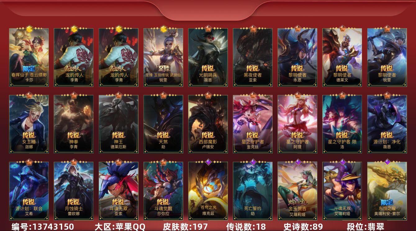 3神话 4限定 18传说 89史诗 197皮肤 可二次 可修改实名 【段位】:翡翠【神话皮】:至臻锐雯,春晖仙子苍云缥缈卡莎,龙的传人【限定皮肤】:龙的传人,烈焰美人薇恩,闭月之颜貂蝉,张辽文远【传说皮】:斗魂觉醒 莎弥拉,黎明使者德莱文,西部魔影卢锡安,天煞劫,神王诺手,神拳盲僧,女主播风女,黎明使者锐雯,黑夜使者亚索,光明哨兵薇恩,星之守护者金克丝,斗魂无双亚索,黎明使者永恩,星之守护者阿狸,月蚀骑士蕾欧娜,源计划:联合,源计划:净化,星之守护者 陨