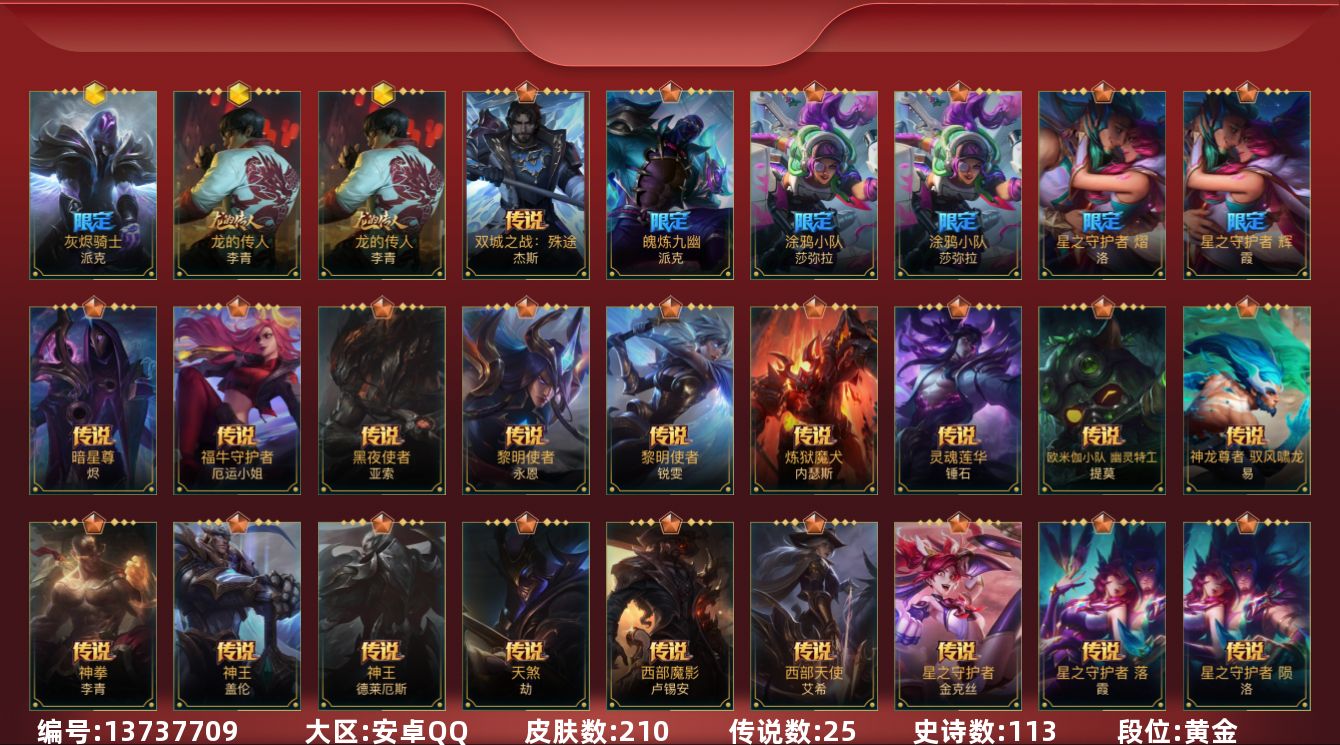 [13737709]2神话 10限定 25传说 113史诗 210皮肤 可修改 【段位】:黄金 【神话皮】:灰烬骑士派克,龙的传人 【限定皮肤】:龙的传人,鸡里奥,星之守护者霞,星之守护者洛,水晶玫瑰皇子,美猴王,水晶玫瑰永恩,水晶玫瑰锐雯,涂鸦小队莎弥拉,山海绘卷剑魔 【传说皮】:暗星尊,心之钢凯隐,魄炼九幽 派克,双城之战:殊途 杰斯,西部天使寒冰,西部魔影卢锡安,天煞劫,神王诺手,神王盖伦,神拳盲僧,神龙尊者 驭风啸龙,欧米伽小队 幽灵特工,炼狱魔犬,黎明使者锐雯,黑夜使者亚索,福牛守护者女枪,星之守护者金克丝,斗魂无双亚索,源计划:泯灭,黎明使者永恩,涂鸦小队莎弥拉,灵魂莲华锤石,驯龙炮手,星之守护者 陨,星之守护者 落