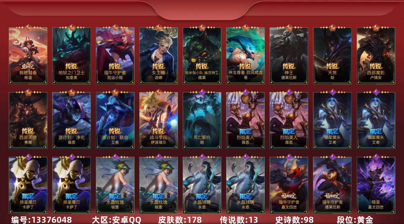[13376048]5限定 13传说 98史诗 178皮肤 可二次 可修改实名