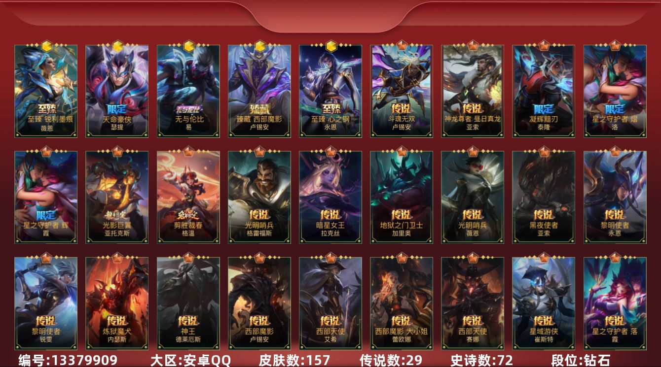 【LSSA167】111英雄/124皮肤/14传说/48史诗/璀璨钻石/神王 盖伦/星之守护者 金克丝/星之守护者 卡莎/黑夜使者 亚索/斗魂无双 亚索/天煞 劫/西部魔影 卢锡安/欧米伽小队 幽灵特工 提莫/律政大亨 蒙多医生/灌篮高手 德莱厄斯/神王 德莱厄斯/西部天使 艾希/黎明使者 锐雯/战斗学院 伊泽瑞尔/钢铁军团 盖伦/惊悚派对 阿木木/殇之机器人 阿木木/地狱火 阿木木/星域先知 卡尔玛/丧尸 努努和威朗普/地狱行者 孙悟空/暗星 奥莉安娜/腥红之月 黛安娜/无限烈焰 黛安娜/斗魂无双 赵信/清剿小队 金克丝/灭迹行者 烬/K/DA ALL OUT 卡莎/魅惑女巫 莫甘娜/清剿英雄联盟手游 - 安卓QQ -