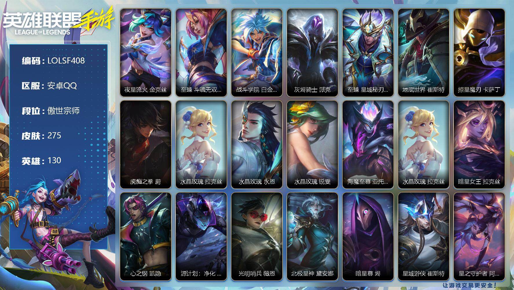 【LOLSF408】130英雄/275皮肤/傲世宗师/夜星流火 金克丝/至臻 斗魂无双 艾瑞莉娅/战斗学院 白金学长 伊泽瑞尔/灰烬骑士 派克/至臻 星域秘刃 泰隆/地底世界 崔斯特/掠星魔刃 卡萨丁/虎痴之拳 蔚/水晶玫瑰 拉克丝/水晶玫瑰 永恩/水晶玫瑰 锐雯/海魔至尊 亚托克斯/暗星女王 拉克丝/心之钢 凯隐/源计划:净化 薇恩/光明哨兵 薇恩/北极星神 黛安娜/暗星尊 烬/星域游侠 崔斯特/星之守护者 阿卡丽/幻灵特战队长 菲奥娜/水晶玫瑰 萨勒芬妮/星域武神 贾克斯/月蚀骑士 蕾欧娜/星之守护者 落 霞/翩翩绣蕊 霞/星之守护者 陨 洛/剪胜裁春 格温/神拳 李青/神龙尊者 圣龙英雄联盟手游 - 安卓QQ -