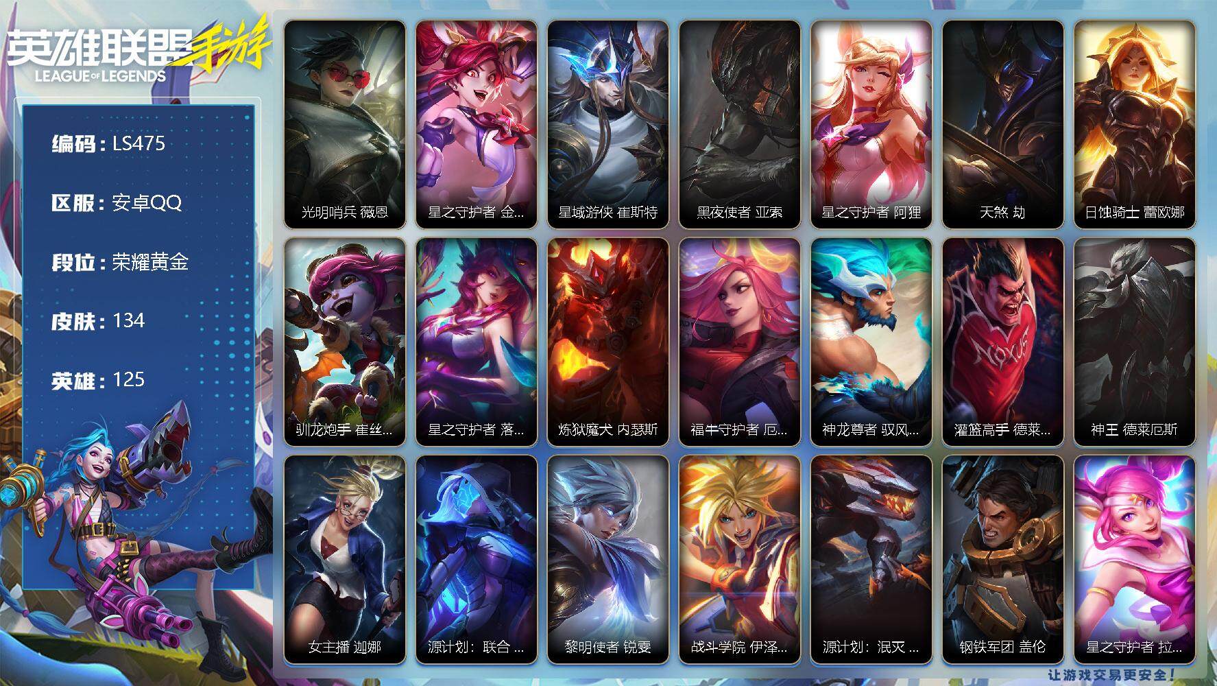 【LS475】125英雄/134皮肤/荣耀黄金/光明哨兵 薇恩/星之守护者 金克丝/星域游侠 崔斯特/黑夜使者 亚索/星之守护者 阿狸/天煞 劫/日蚀骑士 蕾欧娜/驯龙炮手 崔丝塔娜/星之守护者 落 霞/炼狱魔犬 内瑟斯/福牛守护者 厄运小姐/神龙尊者 驭风啸龙 易/灌篮高手 德莱厄斯/神王 德莱厄斯/女主播 迦娜/源计划:联合 艾希/黎明使者 锐雯/战斗学院 伊泽瑞尔/源计划:泯灭 雷克顿/钢铁军团 盖伦/星之守护者 拉克丝/地狱火 阿木木/星域先知 卡尔玛/小蜜蜂 努努和威朗普/腥红之月 黛安娜/无限烈焰 黛安娜/礼物选好了吗? 布隆/腥红之月 烬/灭迹行者 烬/东恒之曜 奥瑞利安·索尔英雄联盟手游 - 安卓QQ -