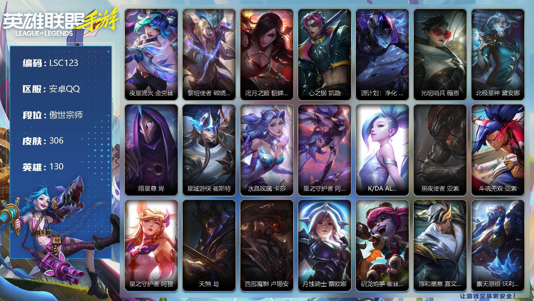 【LSC123】130英雄/306皮肤/2神话/33传说/168史诗/傲世宗师/夜星流火 金克丝/黎明使者 破晓之殇 佛耶戈/闭月之颜 貂蝉 卡特琳娜/心之钢 凯隐/源计划:净化 薇恩/光明哨兵 薇恩/北极星神 黛安娜/暗星尊 烬/星域游侠 崔斯特/水晶玫瑰 卡莎/星之守护者 阿卡丽/K/DA ALL OUT 萨勒芬妮/黑夜使者 亚索/斗魂无双 亚索/星之守护者 阿狸/天煞 劫/西部魔影 卢锡安/月蚀骑士 蕾欧娜/驯龙炮手 崔丝塔娜/淳和墨意 嘉文四世/霸天原祖 沃利贝尔/神拳 李青/炼狱魔犬 内瑟斯/黎明使者 永恩/西部魔影 永恩/神龙尊者 驭风啸龙 易/灌篮高手 德莱厄斯/神王 德莱厄斯