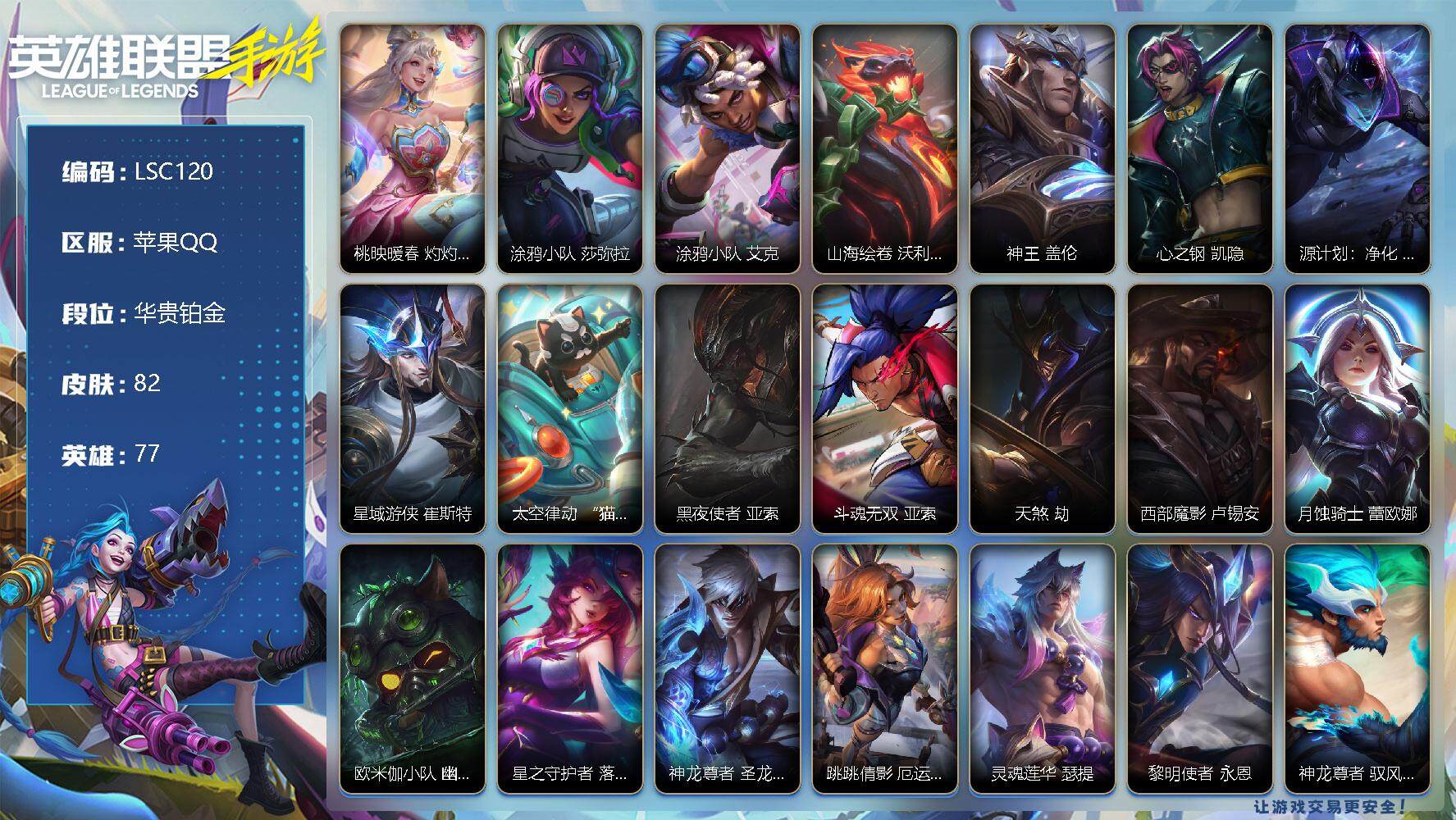 【LSC120】77英雄/82皮肤/1神话/24传说/27史诗/华贵铂金/桃映暖春 灼灼芳菲 拉克丝/涂鸦小队 莎弥拉/涂鸦小队 艾克/山海绘卷 沃利贝尔/神王 盖伦/心之钢 凯隐/源计划:净化 薇恩/星域游侠 崔斯特/太空律动 “猫猫”布里和里茨 布里茨/黑夜使者 亚索/斗魂无双 亚索/天煞 劫/西部魔影 卢锡安/月蚀骑士 蕾欧娜/欧米伽小队 幽灵特工 提莫/星之守护者 落 霞/神龙尊者 圣龙 李青/跳跳倩影 厄运小姐/灵魂莲华 瑟提/黎明使者 永恩/神龙尊者 驭风啸龙 易/灌篮高手 德莱厄斯/神王 德莱厄斯/西部天使 艾希/黎明使者 锐雯/战斗学院 伊泽瑞尔/斗魂觉醒 莎弥拉/腥红之月英雄联盟手游 - 苹果QQ -