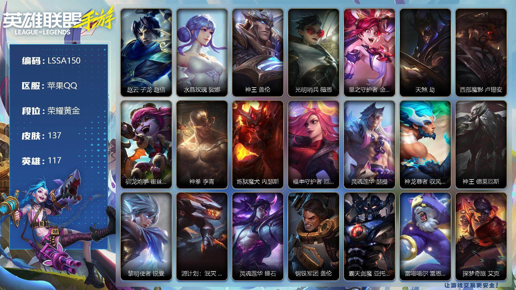 【LSSA150】117英雄/137皮肤/15传说/62史诗/荣耀黄金/赵云 子龙 赵信/水晶玫瑰 娑娜/神王 盖伦/光明哨兵 薇恩/星之守护者 金克丝/天煞 劫/西部魔影 卢锡安/驯龙炮手 崔丝塔娜/神拳 李青/炼狱魔犬 内瑟斯/福牛守护者 厄运小姐/灵魂莲华 瑟提/神龙尊者 驭风啸龙 易/神王 德莱厄斯/黎明使者 锐雯/源计划:泯灭 雷克顿/灵魂莲华 锤石/钢铁军团 盖伦/霸天剑魔 亚托克斯/雷喵喵尔 雷恩加尔/探梦奇旅 艾克/无限烈焰 黛安娜/恶魔之刃 泰达米尔/清剿小队 金克丝/末路管家 布隆/猛虎 布隆/灭迹行者 烬/灰烬领主 奥瑞利安·索尔/电玩女神 卡莎/源计划:火 菲奥娜/泳英雄联盟手游 - 苹果QQ -