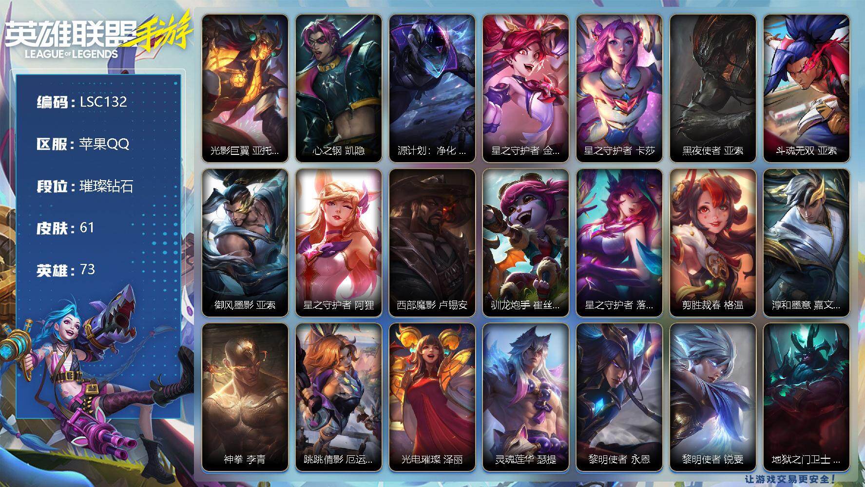 【LSC132】73英雄/61皮肤/璀璨钻石/光影巨翼 亚托克斯/心之钢 凯隐/源计划:净化 薇恩/星之守护者 金克丝/星之守护者 卡莎/黑夜使者 亚索/斗魂无双 亚索/御风墨影 亚索/星之守护者 阿狸/西部魔影 卢锡安/驯龙炮手 崔丝塔娜/星之守护者 落 霞/剪胜裁春 格温/淳和墨意 嘉文四世/神拳 李青/跳跳倩影 厄运小姐/光电璀璨 泽丽/灵魂莲华 瑟提/黎明使者 永恩/黎明使者 锐雯/地狱之门卫士 加里奥/斗魂觉醒 莎弥拉/源计划:泯灭 雷克顿/最终BOSS 维迦/端劲墨印 泰达米尔/铁血女忍 阿卡丽/死亡誓约 劫/秀逸墨羽 霞/星域审判官 卡蜜尔/玉剑传说 风仙子 迦娜/温雅墨曲 迦英雄联盟手游 - 苹果QQ -