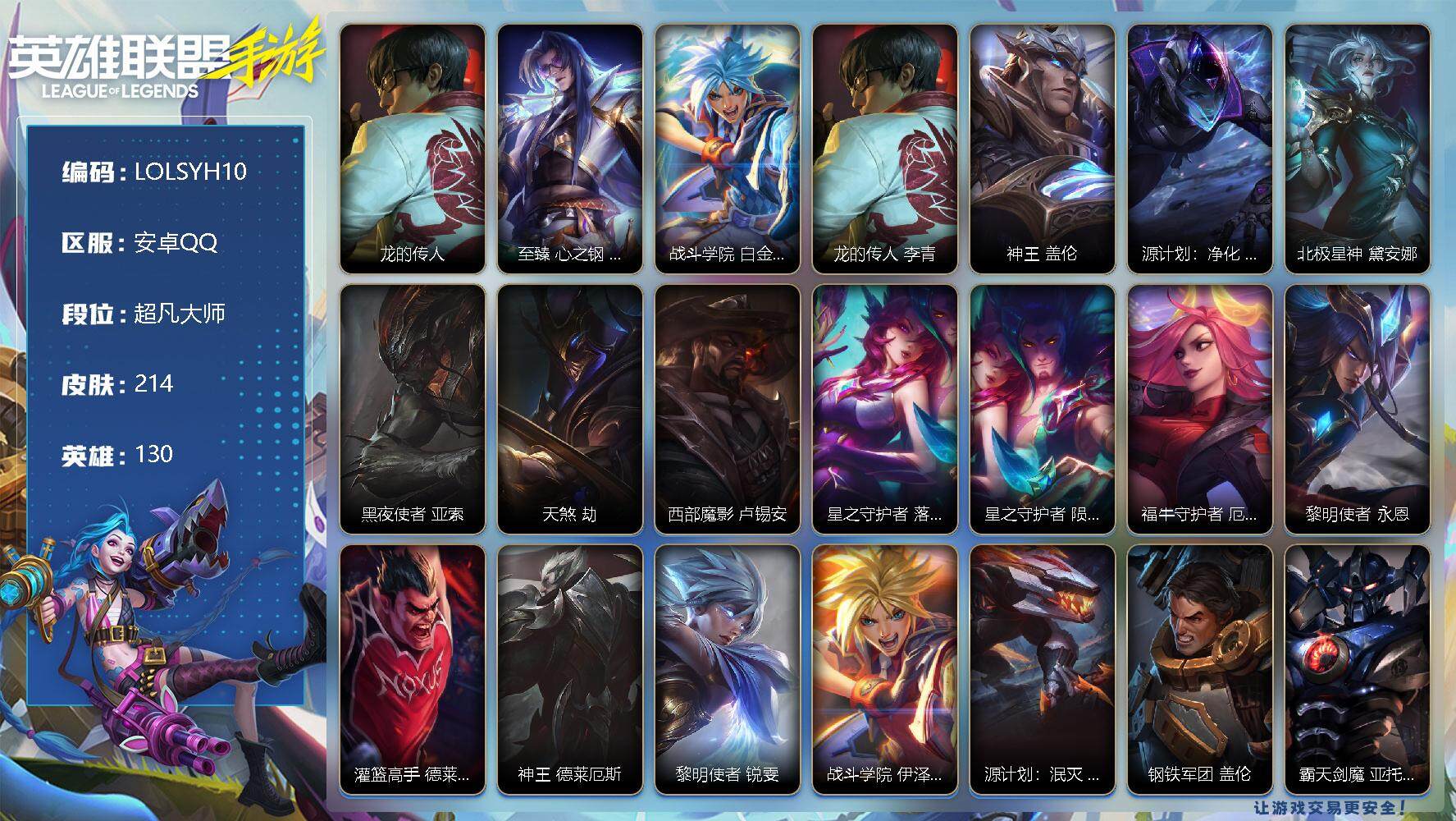 【LOLSYH10】130英雄/214皮肤/超凡大师/龙的传人 李青/至臻 心之钢 永恩/战斗学院 白金学长 伊泽瑞尔/神王 盖伦/源计划:净化 薇恩/北极星神 黛安娜/黑夜使者 亚索/天煞 劫/西部魔影 卢锡安/星之守护者 落 霞/星之守护者 陨 洛/福牛守护者 厄运小姐/黎明使者 永恩/灌篮高手 德莱厄斯/神王 德莱厄斯/黎明使者 锐雯/战斗学院 伊泽瑞尔/源计划:泯灭 雷克顿/钢铁军团 盖伦/霸天剑魔 亚托克斯/腥红之月 亚托克斯/殇之机器人 阿木木/地狱火 阿木木/小蜜蜂 努努和威朗普/探梦奇旅 艾克/星之守护者 奥莉安娜/黑夜使者 泰达米尔/猎龙勇士 赵信/霸天异形 卡兹克/灰烬领英雄联盟手游 - 安卓QQ -