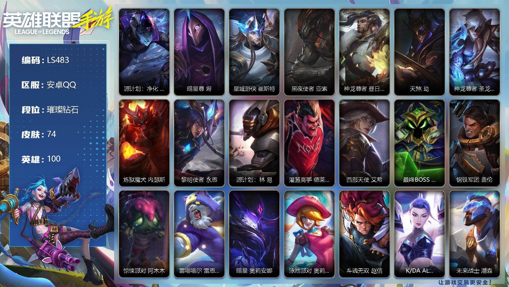 【LS483】100英雄/74皮肤/13传说/璀璨钻石/源计划:净化 薇恩/暗星尊 烬/星域游侠 崔斯特/黑夜使者 亚索/神龙尊者 昼日真龙 亚索/天煞 劫/神龙尊者 圣龙 李青/炼狱魔犬 内瑟斯/黎明使者 永恩/源计划:林 易/灌篮高手 德莱厄斯/西部天使 艾希/最终BOSS 维迦/钢铁军团 盖伦/惊悚派对 阿木木/雷喵喵尔 雷恩加尔/暗星 奥莉安娜/泳池派对 奥莉安娜/斗魂无双 赵信/K/DA ALL OUT 卡莎/未来战士 潘森/玉剑传说 无双 菲奥娜/K/DA ALL OUT 阿狸/小蜜蜂 提莫/寒冬精灵 璐璐/地下拳王 李青/电玩上校 库奇/龙腾虎跃 瑟提/泳池派对 格雷福斯/电玩英雄联盟手游 - 安卓QQ -