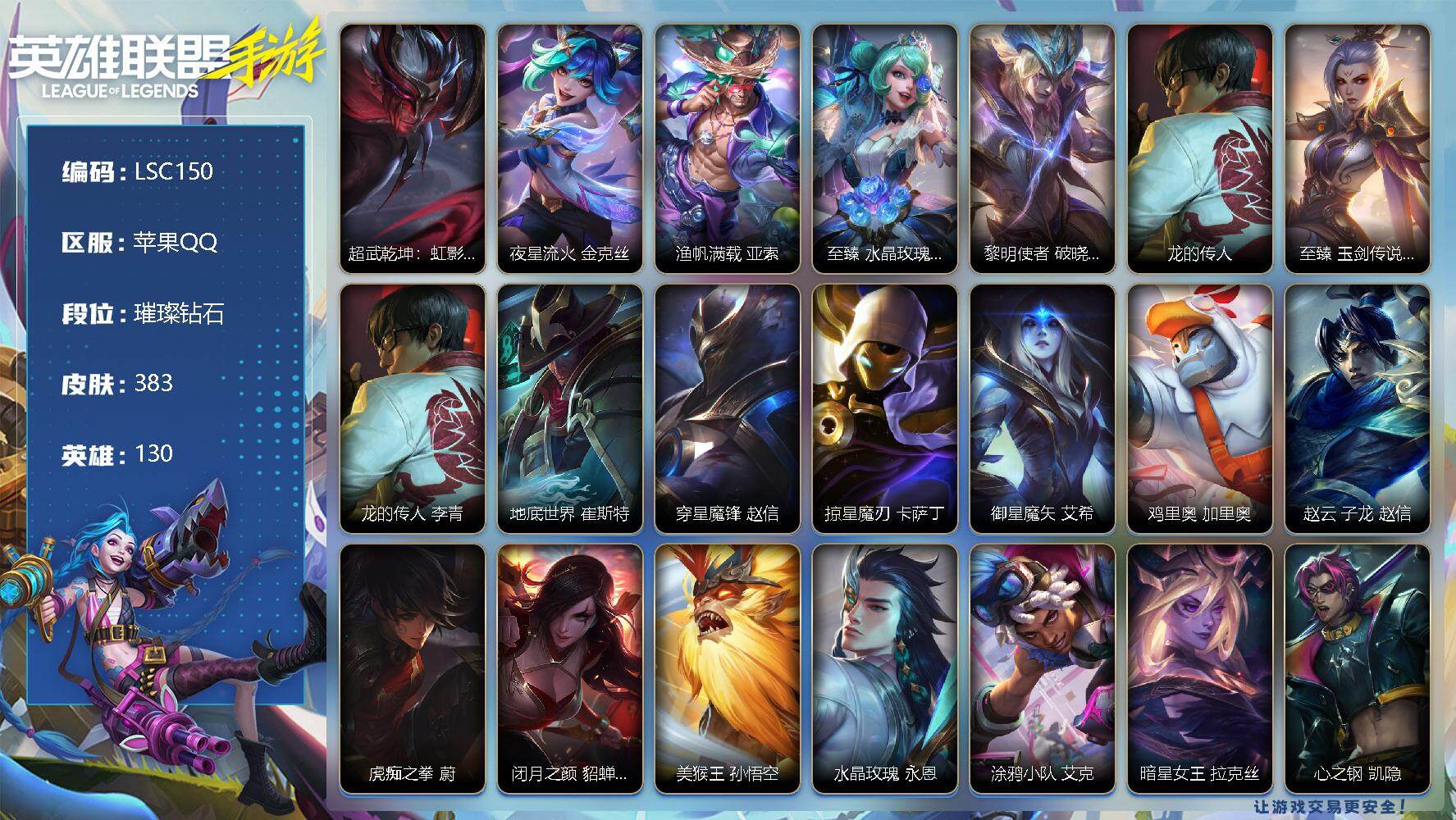 【LSC150】130英雄/383皮肤/1典藏/6神话/37传说/205史诗/璀璨钻石/超武乾坤:虹影 劫/夜星流火 金克丝/渔帆满载 亚索/至臻 水晶玫瑰 格温/黎明使者 破晓之殇 佛耶戈/龙的传人 李青/至臻 玉剑传说 武剑仙 锐雯/地底世界 崔斯特/穿星魔锋 赵信/掠星魔刃 卡萨丁/御星魔矢 艾希/鸡里奥 加里奥/赵云 子龙 赵信/虎痴之拳 蔚/闭月之颜 貂蝉 卡特琳娜/美猴王 孙悟空/水晶玫瑰 永恩/涂鸦小队 艾克/暗星女王 拉克丝/心之钢 凯隐/源计划:净化 薇恩/光明哨兵 薇恩/北极星神 黛安娜/星之守护者 金克丝/暗星尊 烬/星域游侠 崔斯特/魔女 伊芙琳/K/DA ALL O