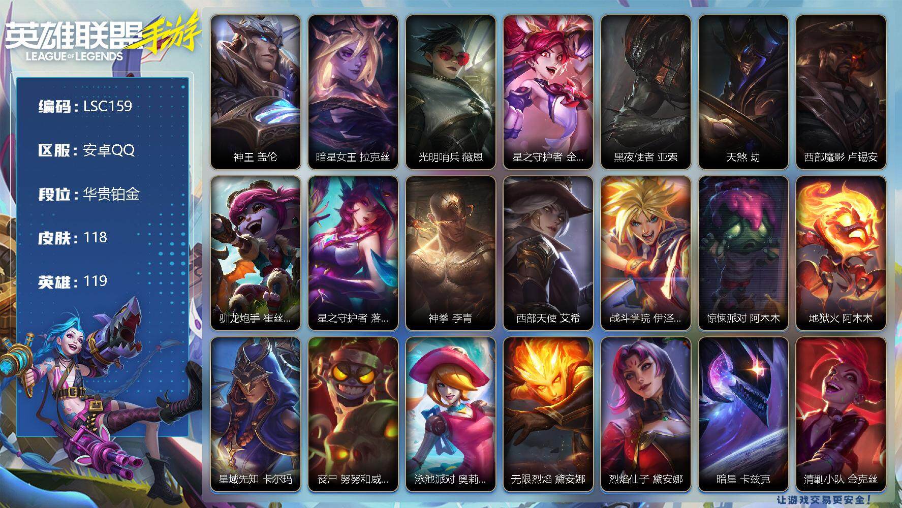 【LSC159】119英雄/118皮肤/11传说/49史诗/华贵铂金/神王 盖伦/暗星女王 拉克丝/光明哨兵 薇恩/星之守护者 金克丝/黑夜使者 亚索/天煞 劫/西部魔影 卢锡安/驯龙炮手 崔丝塔娜/星之守护者 落 霞/神拳 李青/西部天使 艾希/战斗学院 伊泽瑞尔/惊悚派对 阿木木/地狱火 阿木木/星域先知 卡尔玛/丧尸 努努和威朗普/泳池派对 奥莉安娜/无限烈焰 黛安娜/烈焰仙子 黛安娜/暗星 卡兹克/清剿小队 金克丝/猛虎 布隆/灭迹行者 烬/东恒之曜 奥瑞利安·索尔/弹幕天使 卡莎/K/DA ALL OUT 伊芙琳/源计划:暗影 阿卡丽/源计划:火 菲奥娜/玉剑传说 无双 菲奥娜/战英雄联盟手游 - 安卓QQ -