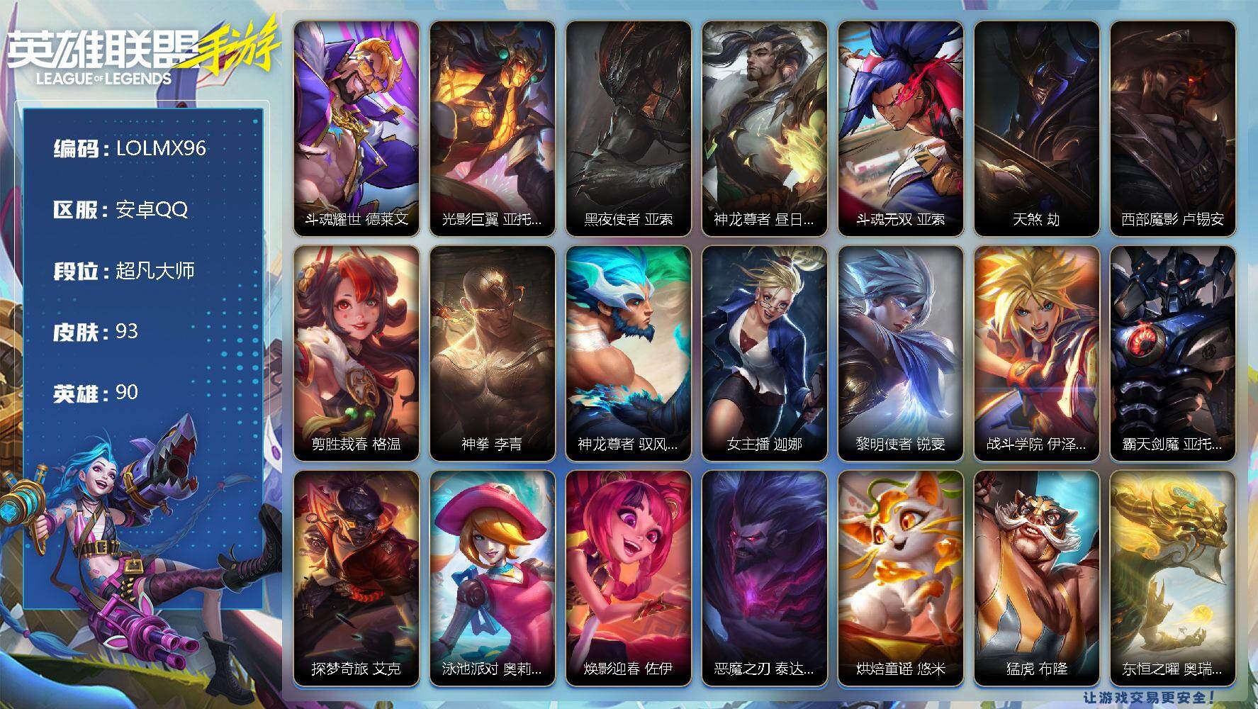 【LOLMX96】90英雄/93皮肤/超凡大师/斗魂耀世 德莱文/光影巨翼 亚托克斯/黑夜使者 亚索/神龙尊者 昼日真龙 亚索/斗魂无双 亚索/天煞 劫/西部魔影 卢锡安/剪胜裁春 格温/神拳 李青/神龙尊者 驭风啸龙 易/女主播 迦娜/黎明使者 锐雯/战斗学院 伊泽瑞尔/霸天剑魔 亚托克斯/探梦奇旅 艾克/泳池派对 奥莉安娜/焕影迎春 佐伊/恶魔之刃 泰达米尔/烘焙童谣 悠米/猛虎 布隆/东恒之曜 奥瑞利安·索尔/神龙尊者 玉境灵龙 卡莎/斗魂无双 尼菈/K/DA ALL OUT 阿卡丽/战场之王 布里茨/悦鼓春生 萨勒芬妮/源计划:风 亚索/灵能特工 劫/灵能特工 凯尔/屠龙勇士 凯尔/英雄联盟手游 - 安卓QQ -