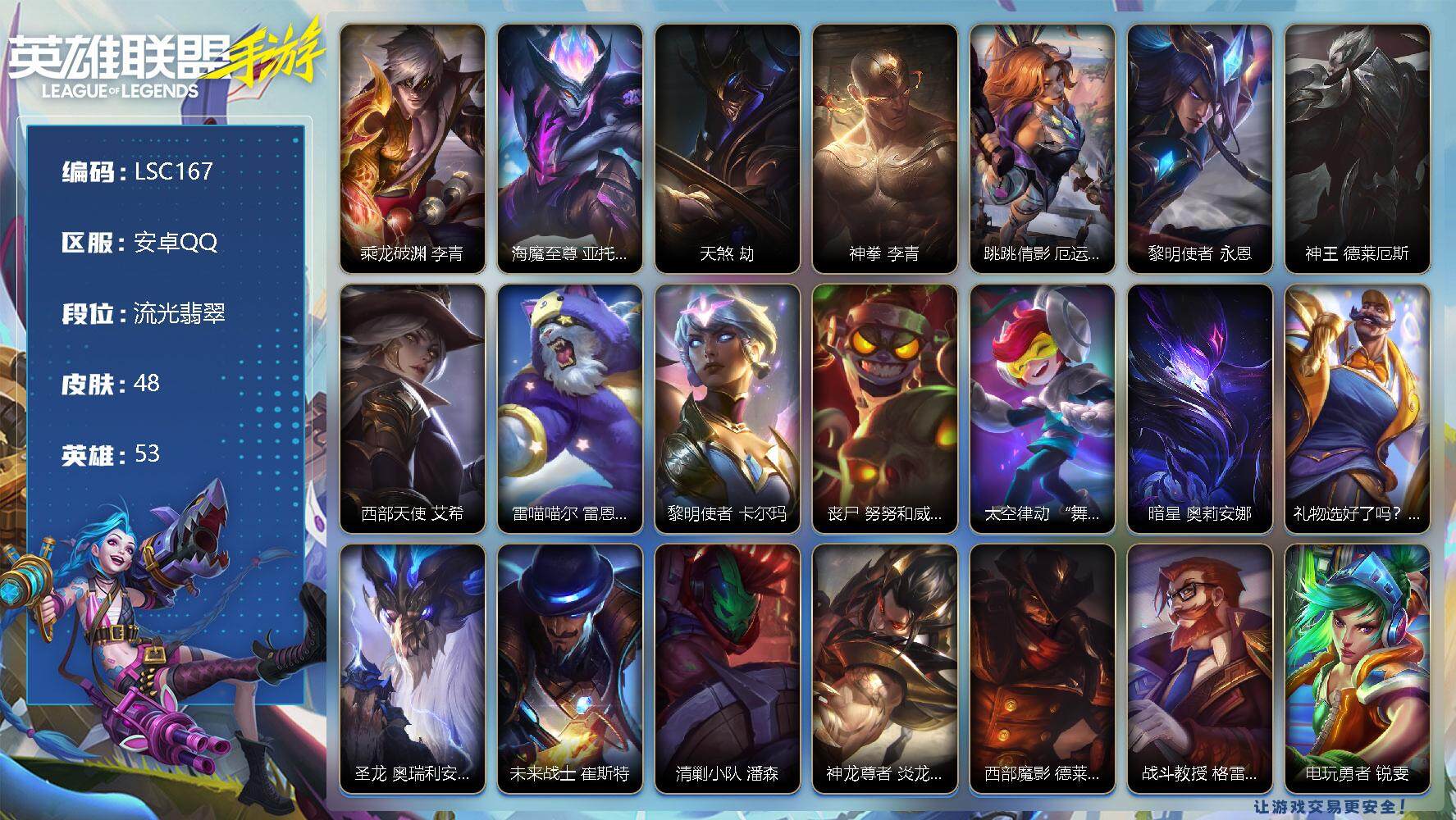 【LSC167】53英雄/48皮肤/流光翡翠/乘龙破渊 李青/海魔至尊 亚托克斯/天煞 劫/神拳 李青/跳跳倩影 厄运小姐/黎明使者 永恩/神王 德莱厄斯/西部天使 艾希/雷喵喵尔 雷恩加尔/黎明使者 卡尔玛/丧尸 努努和威朗普/太空律动 “舞林双子” 努努和威朗普/暗星 奥莉安娜/礼物选好了吗? 布隆/圣龙 奥瑞利安·索尔/未来战士 崔斯特/清剿小队 潘森/神龙尊者 炎龙 瑟提/西部魔影 德莱厄斯/战斗教授 格雷福斯/电玩勇者 锐雯/玉剑传说 舞剑仙 艾瑞莉娅/星域学者 索拉卡/猎龙勇士 奥拉夫/泳池派对 凯特琳/苍穹之光 布兰德/欧米伽小队 天雷爆破手 维迦/黑夜使者 莉莉娅/梦游仙境英雄联盟手游 - 安卓QQ -