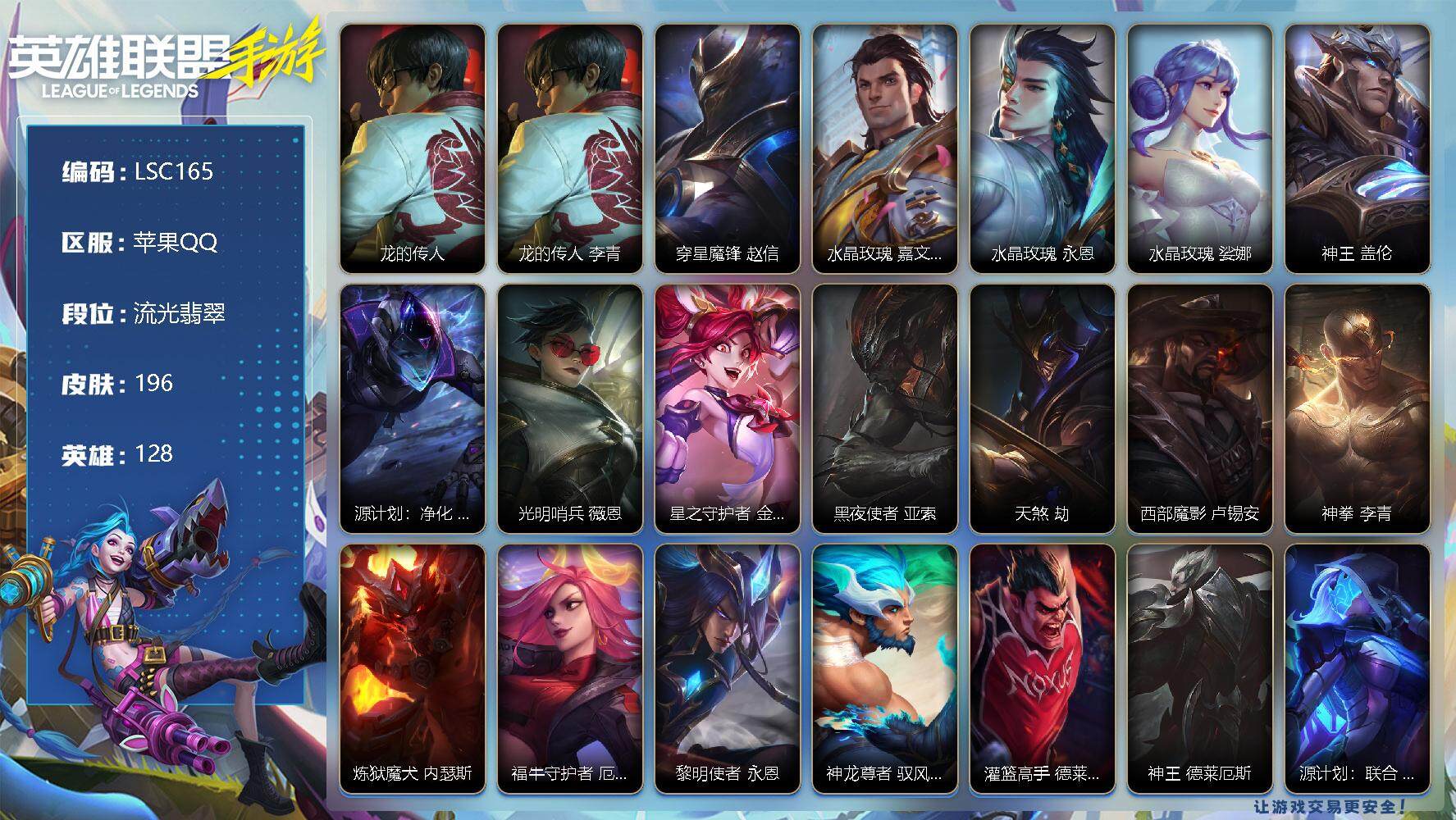 【LSC165】128英雄/196皮肤/1神话/19传说/76史诗/流光翡翠/龙的传人 李青/穿星魔锋 赵信/水晶玫瑰 嘉文四世/水晶玫瑰 永恩/水晶玫瑰 娑娜/神王 盖伦/源计划:净化 薇恩/光明哨兵 薇恩/星之守护者 金克丝/黑夜使者 亚索/天煞 劫/西部魔影 卢锡安/神拳 李青/炼狱魔犬 内瑟斯/福牛守护者 厄运小姐/黎明使者 永恩/神龙尊者 驭风啸龙 易/灌篮高手 德莱厄斯/神王 德莱厄斯/源计划:联合 艾希/西部天使 艾希/黎明使者 锐雯/地狱之门卫士 加里奥/灵魂莲华 锤石/霸天剑魔 亚托克斯/战斗学院 拉克丝/摄魂猎手 凯隐/雷喵喵尔 雷恩加尔/黎明使者 卡尔玛/探梦奇旅 艾克