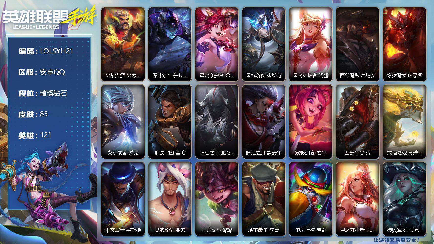 【LOLSYH21】121英雄/85皮肤/璀璨钻石/火焰澎湃 火力全开 格雷福斯/源计划:净化 薇恩/星之守护者 金克丝/星域游侠 崔斯特/星之守护者 阿狸/西部魔影 卢锡安/炼狱魔犬 内瑟斯/黎明使者 锐雯/钢铁军团 盖伦/腥红之月 亚托克斯/腥红之月 黛安娜/焕影迎春 佐伊/西部牛仔 烬/东恒之曜 奥瑞利安·索尔/未来战士 崔斯特/灵魂莲华 亚索/驯龙女巫 璐璐/地下拳王 李青/电玩上校 库奇/星之守护者 厄运小姐/破败军团 厄运小姐/玉剑传说 风仙子 迦娜/冰川巨兽 墨菲特/暗星 墨菲特/欧米伽小队 鬼影蛙人 菲兹/暗星 韦鲁斯/战斗学院 卡特琳娜/电玩勇者 伊泽瑞尔/地狱火 加里奥/英雄联盟手游 - 安卓QQ -