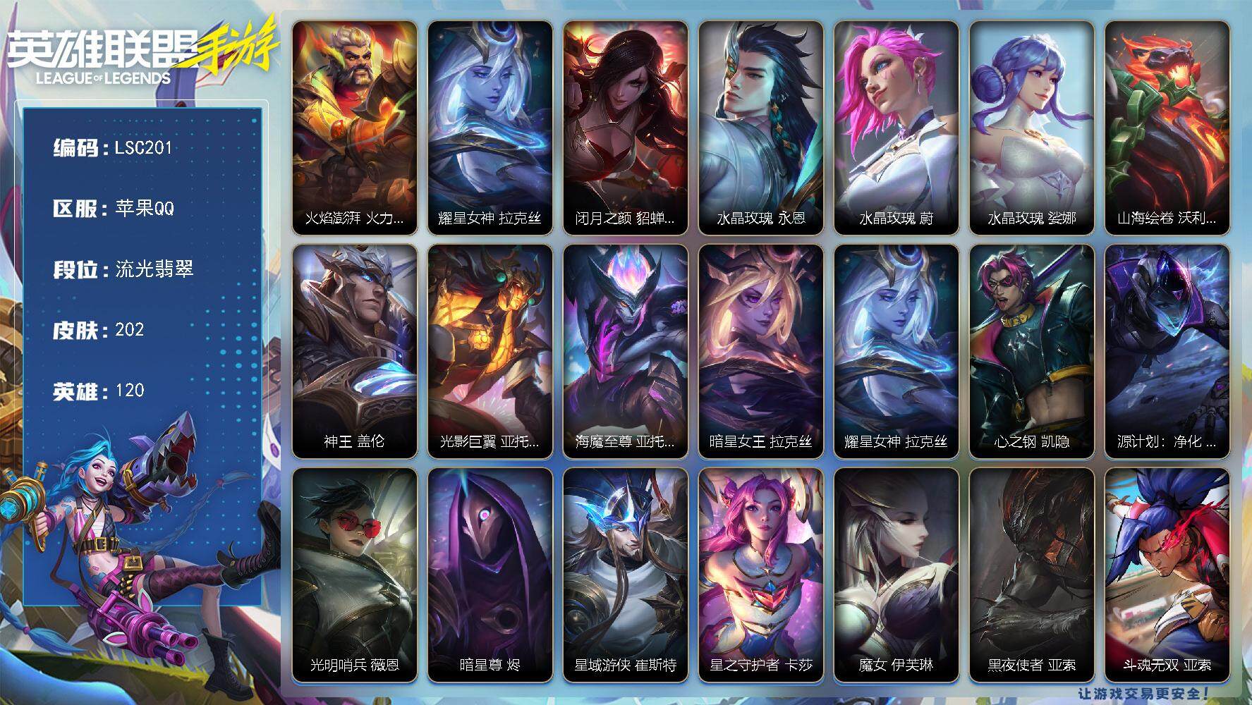 【LSC201】120英雄/202皮肤/1神话/38传说/106史诗/流光翡翠/火焰澎湃 火力全开 格雷福斯/耀星女神 拉克丝/闭月之颜 貂蝉 卡特琳娜/水晶玫瑰 永恩/水晶玫瑰 蔚/水晶玫瑰 娑娜/山海绘卷 沃利贝尔/神王 盖伦/光影巨翼 亚托克斯/海魔至尊 亚托克斯/暗星女王 拉克丝/心之钢 凯隐/源计划:净化 薇恩/光明哨兵 薇恩/暗星尊 烬/星域游侠 崔斯特/星之守护者 卡莎/魔女 伊芙琳/黑夜使者 亚索/斗魂无双 亚索/星之守护者 阿狸/天煞 劫/西部魔影 卢锡安/日蚀骑士 蕾欧娜/驯龙炮手 崔丝塔娜/欧米伽小队 幽灵特工 提莫/星之守护者 落 霞/星之守护者 陨 洛/剪胜裁春 格英雄联盟手游 - 苹果QQ -