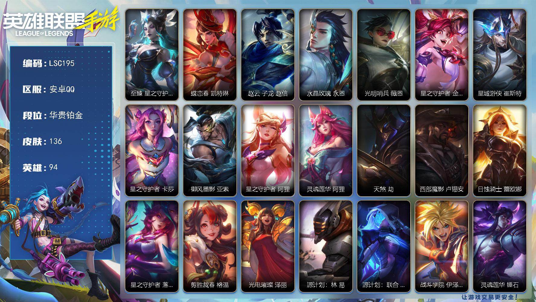【LSC195】94英雄/136皮肤/2神话/17传说/70史诗/华贵铂金/至臻 星之守护者 辛德拉/蝶恋春 凯特琳/赵云 子龙 赵信/水晶玫瑰 永恩/光明哨兵 薇恩/星之守护者 金克丝/星域游侠 崔斯特/星之守护者 卡莎/御风墨影 亚索/星之守护者 阿狸/灵魂莲华 阿狸/天煞 劫/西部魔影 卢锡安/日蚀骑士 蕾欧娜/星之守护者 落 霞/剪胜裁春 格温/光电璀璨 泽丽/源计划:林 易/源计划:联合 艾希/战斗学院 伊泽瑞尔/灵魂莲华 锤石/桃映暖春 拉克丝/地狱火 阿木木/神龙尊者 宁静之龙 卡尔玛/小蜜蜂 努努和威朗普/水晶玫瑰 薇恩/星之守护者 奥莉安娜/恶魔之刃 泰达米尔/端劲墨印 泰英雄联盟手游 - 安卓QQ -