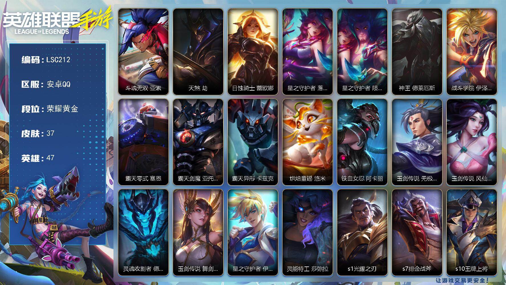 【LSC212】47英雄/37皮肤/8传说/10史诗/荣耀黄金/斗魂无双 亚索/天煞 劫/日蚀骑士 蕾欧娜/星之守护者 落 霞/星之守护者 陨 洛/神王 德莱厄斯/战斗学院 伊泽瑞尔/霸天零式 赛恩/霸天剑魔 亚托克斯/霸天异形 卡兹克/烘焙童谣 悠米/铁血女忍 阿卡丽/玉剑传说 无极 易/玉剑传说 风仙子 迦娜/灵魂收割者 德莱文/玉剑传说 舞剑仙 艾瑞莉娅/星之守护者 伊泽瑞尔/灵能特工 莎弥拉/s1光耀之刃/s7绯金战斧/s10王牌上将/s11王牌司令/s16冠翎飞行员/s17冠翎御风使/斗战胜佛 孙悟空/光耀之刃 泰达米尔/逍遥赌侠 崔斯特/刀锋女王 莫甘娜/擂台皇帝 布里茨/西部牛